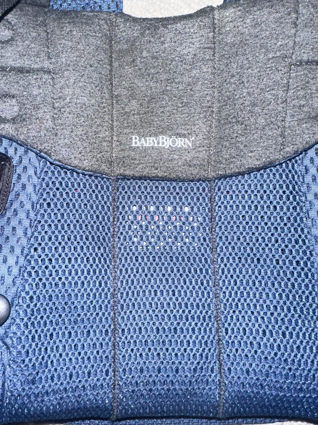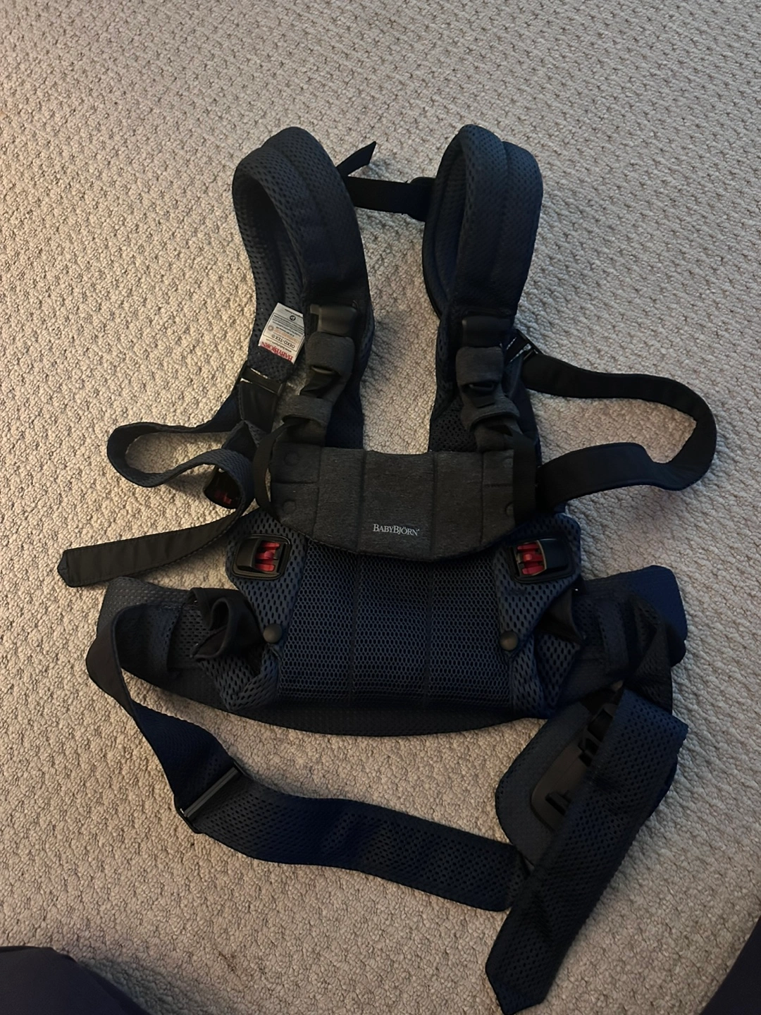 I'm selling a BabyBjorn baby carrier in navy blue. It's in great condition and ready for a new little one! This carrier is super convenient for keeping your baby close while you're on the go. It's lightweight and comfortable for both you and your baby