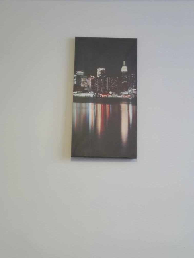 Canvas print featuring a nighttime cityscape. Shows city skyline reflected in water. Sleek, modern design. Perfect for a home office or living room.
