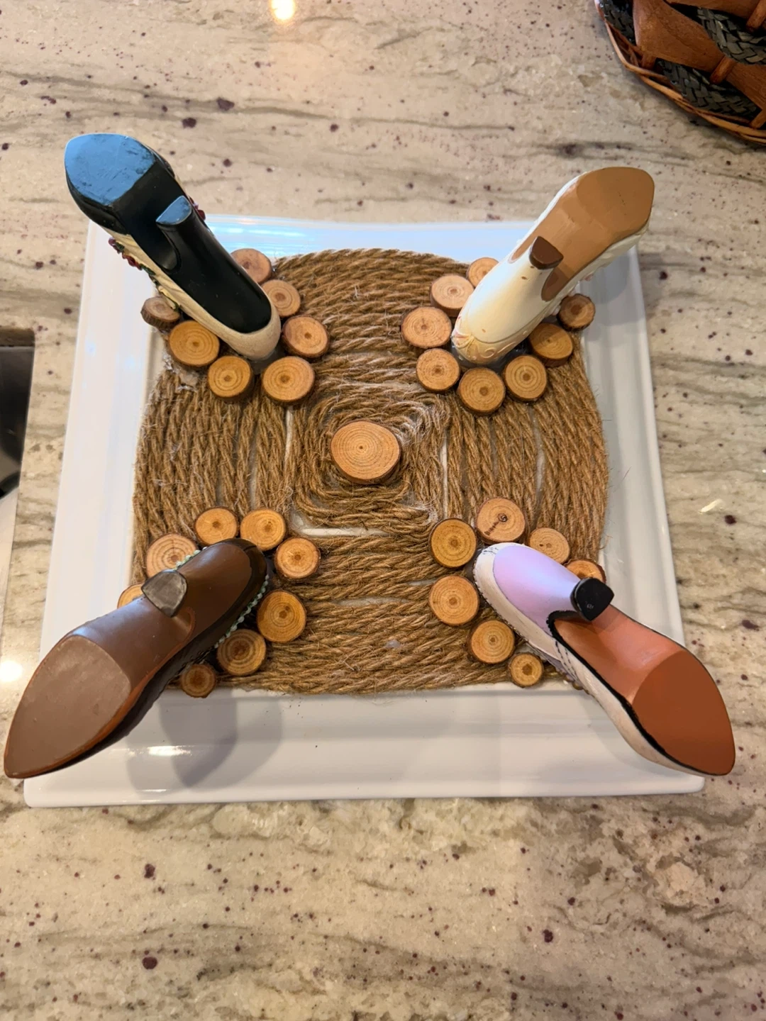 Square white serving platter with four decorative shoe-shaped legs. It's made of ceramic with a rope and wood accent design. This unique piece is perfect for displaying appetizers or desserts!