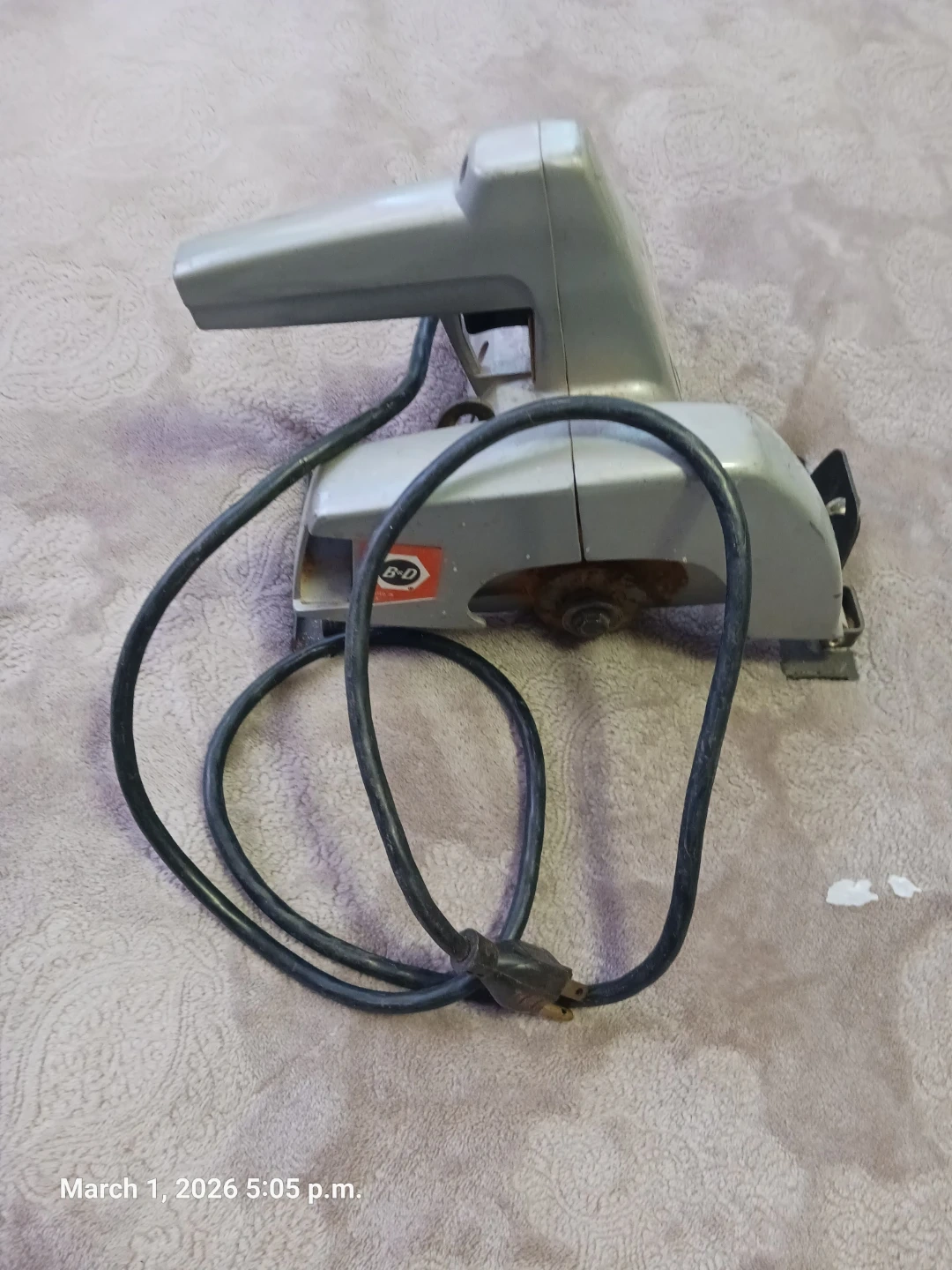 This is a Black & Decker 7 1/4" circular saw. It's a Type 1 model with a 120 AC voltage rating and 4900 RPM. Saw is made by Black & Decker Mfg. Co. in Brockville, Ontario, Canada. It's suitable for various cutting tasks.