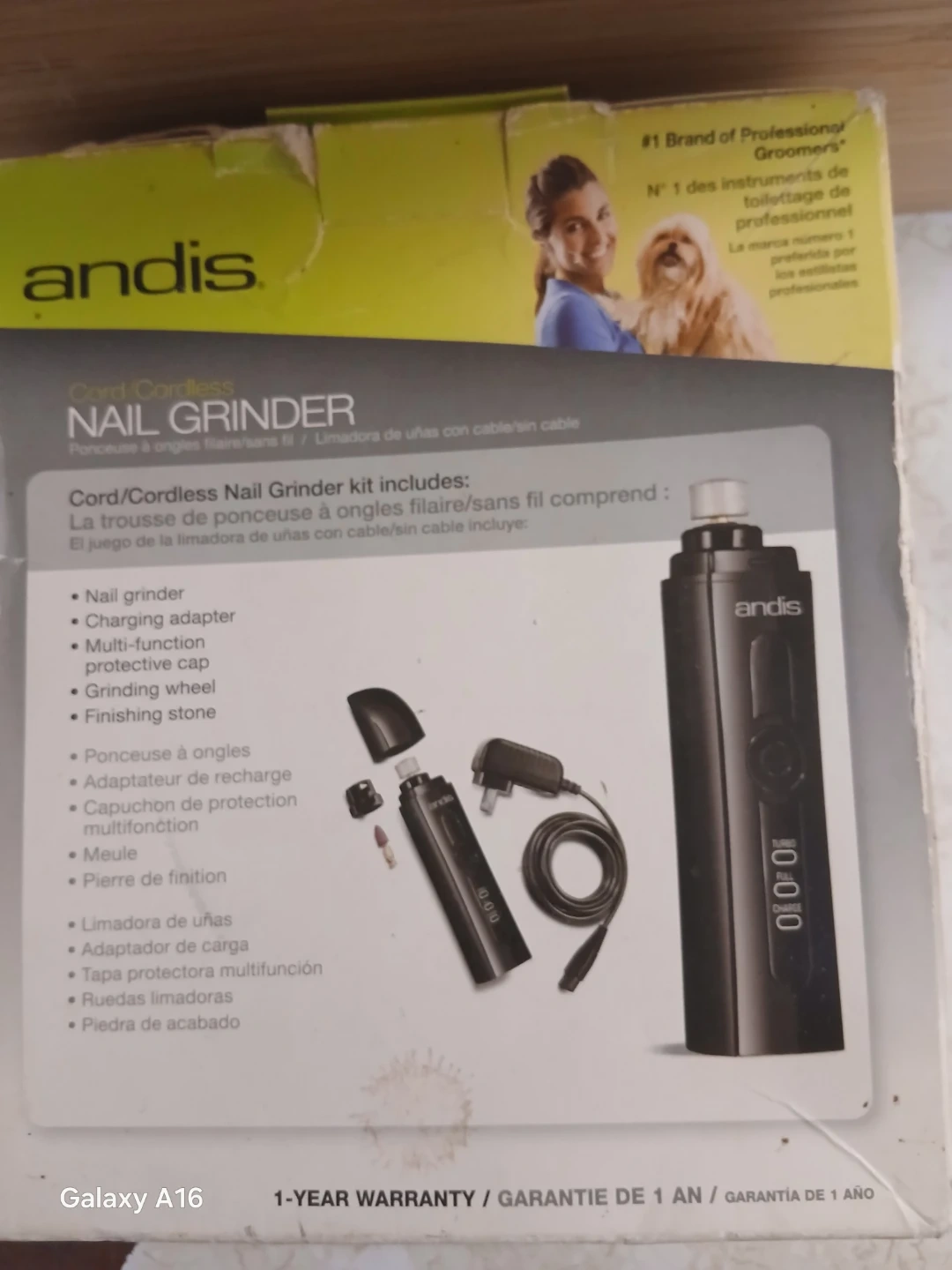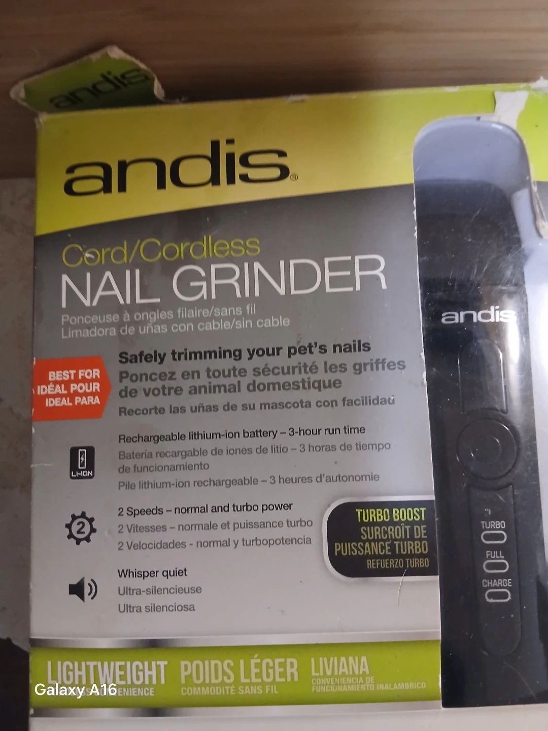 Easily trim your pet's nails with this Andis Cord/Cordless Nail Grinder. It features a rechargeable lithium-ion battery with a 3-hour run time and offers 2 speeds with turbo boost. Includes nail grinder, charging adapter, multi-function protective cap, grinding wheel, and finishing stone.