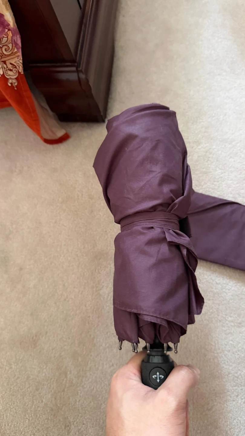 A plum-coloured foldable umbrella. It's a compact size for easy carrying. Great for unexpected rain showers!
