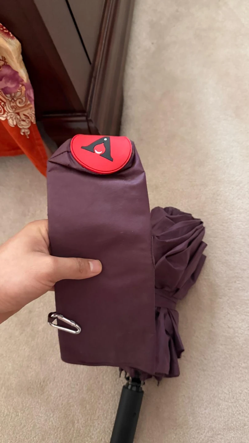 A plum-coloured foldable umbrella. It's a compact size for easy carrying. Great for unexpected rain showers!