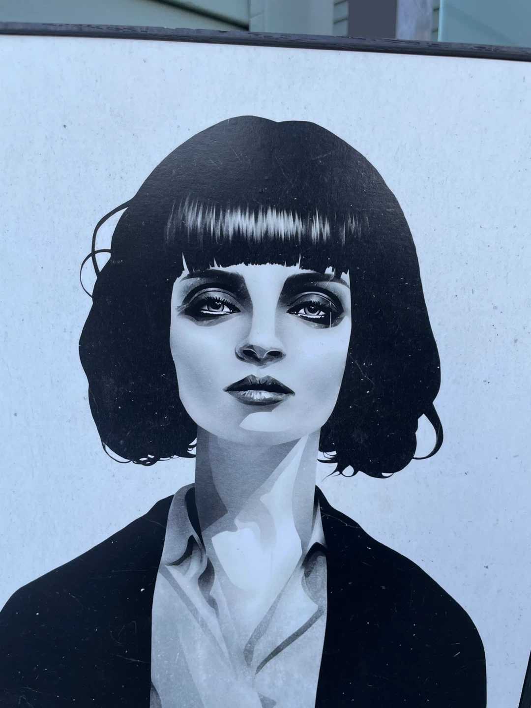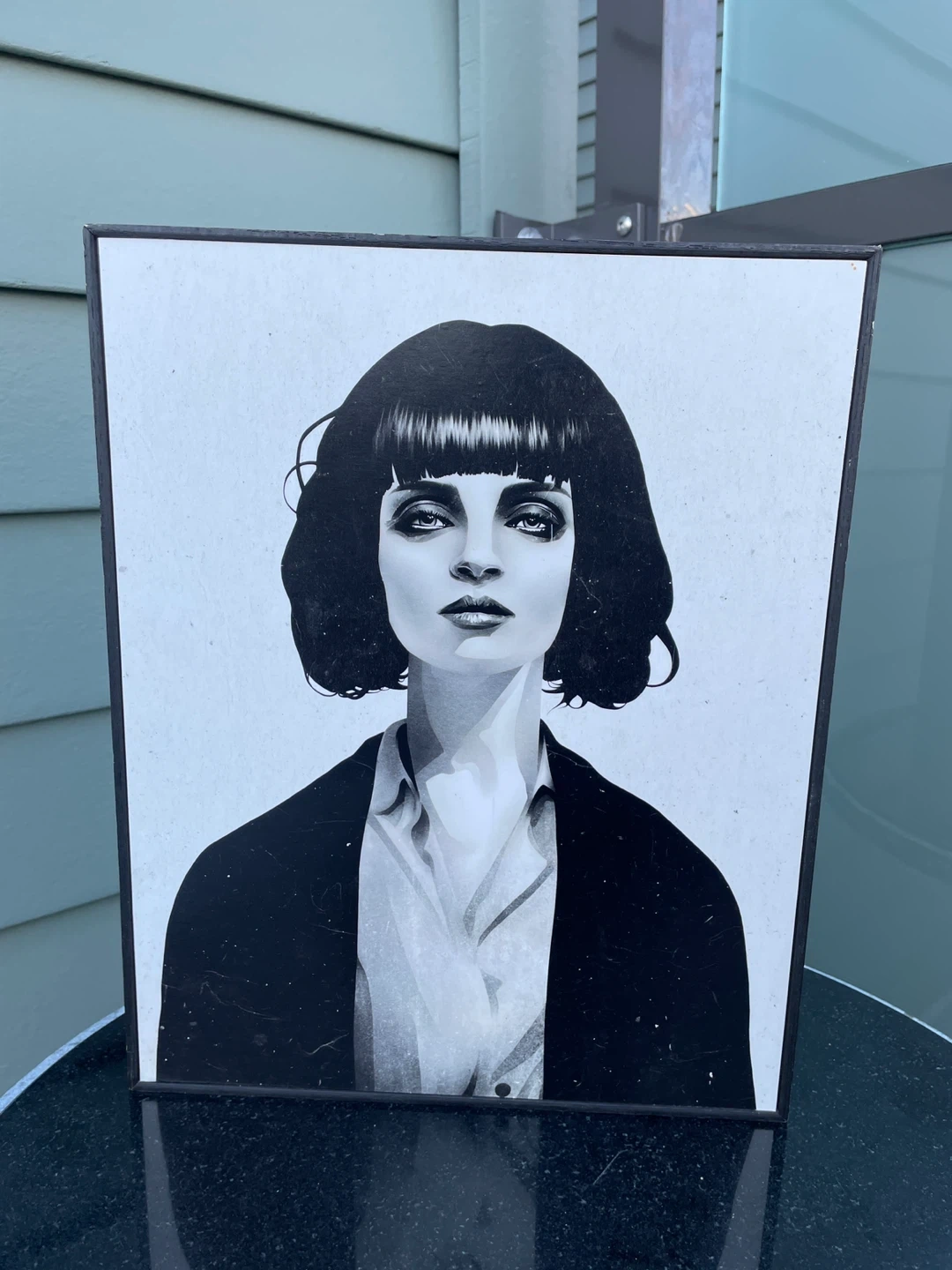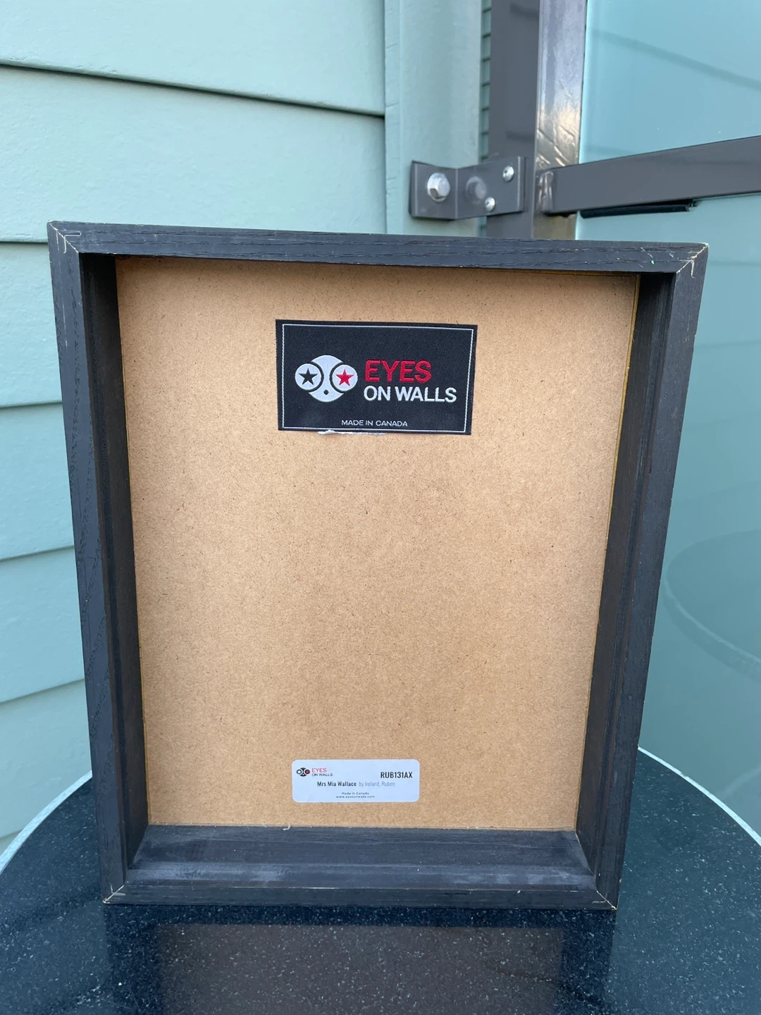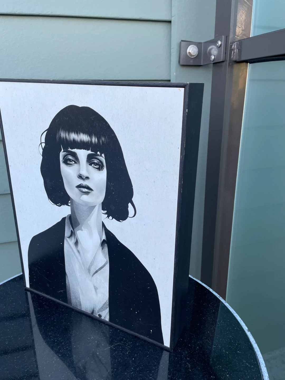 This framed art print features Mia Wallace from Pulp Fiction. It's made by Eyes on Walls and includes a black wood frame. 9.5” x 12”.