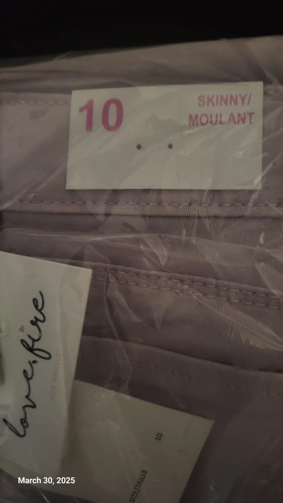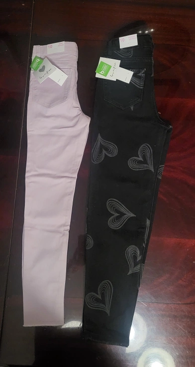 Two pairs of girls' size 10 jeans. One pair light purple, one pair black with grey heart pattern. NEW. From a smoke-free home.