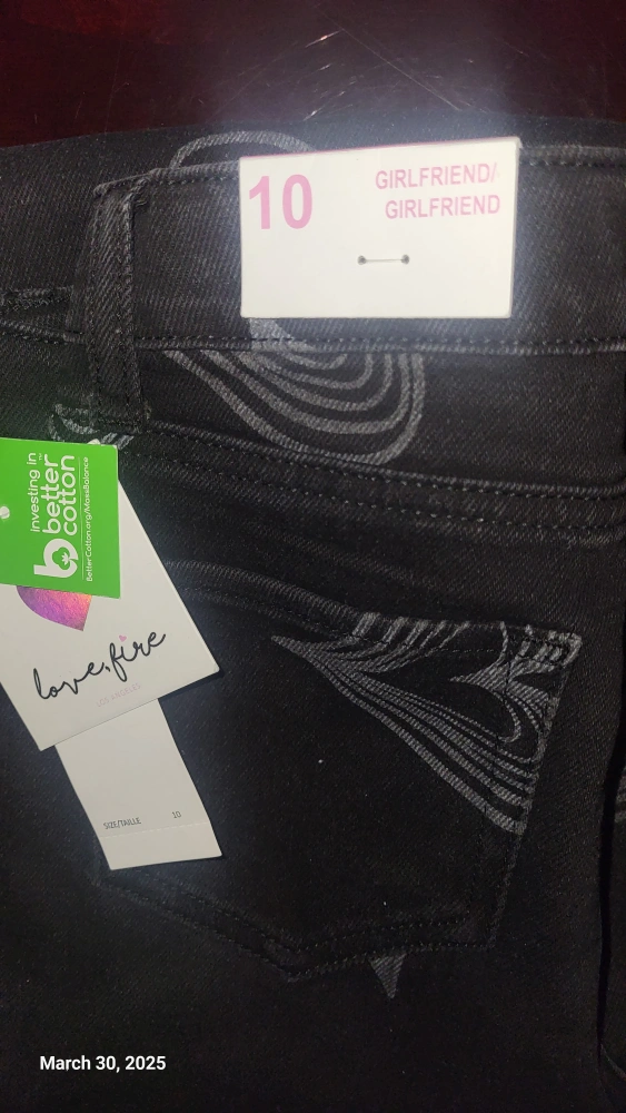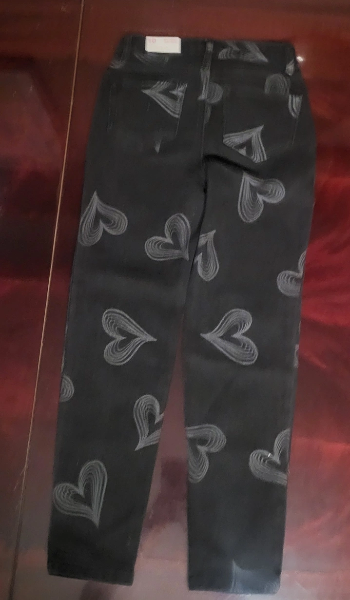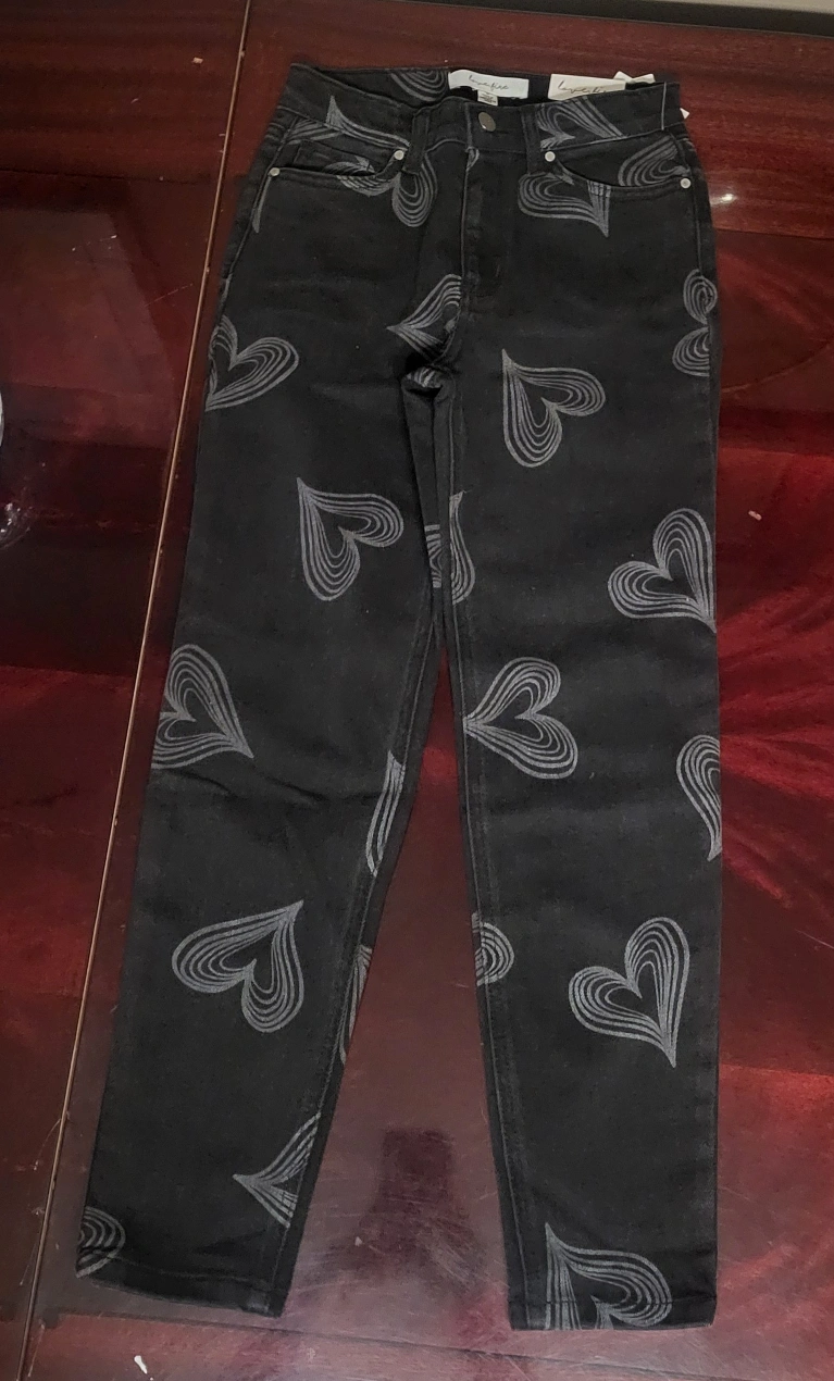 Two pairs of girls' size 10 jeans. One pair light purple, one pair black with grey heart pattern. NEW. From a smoke-free home.