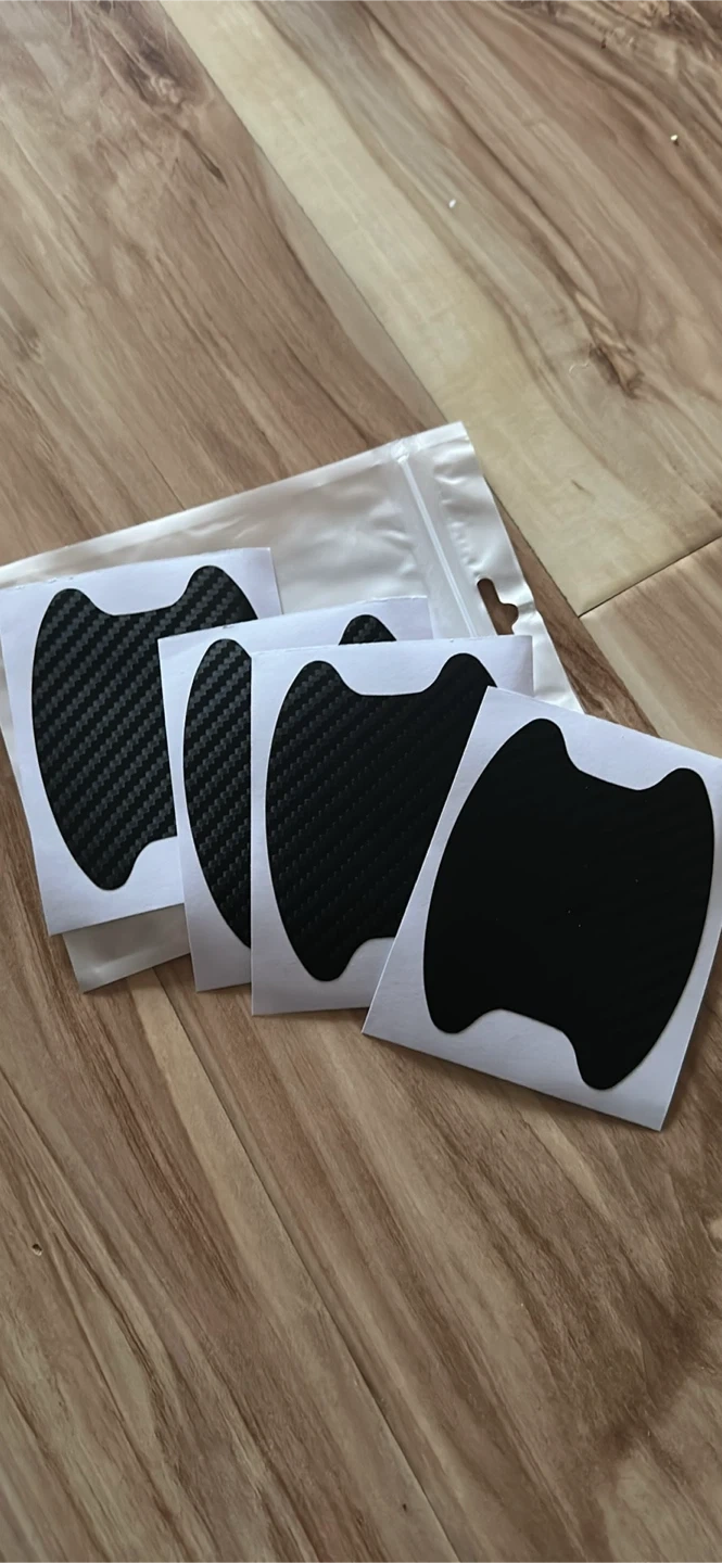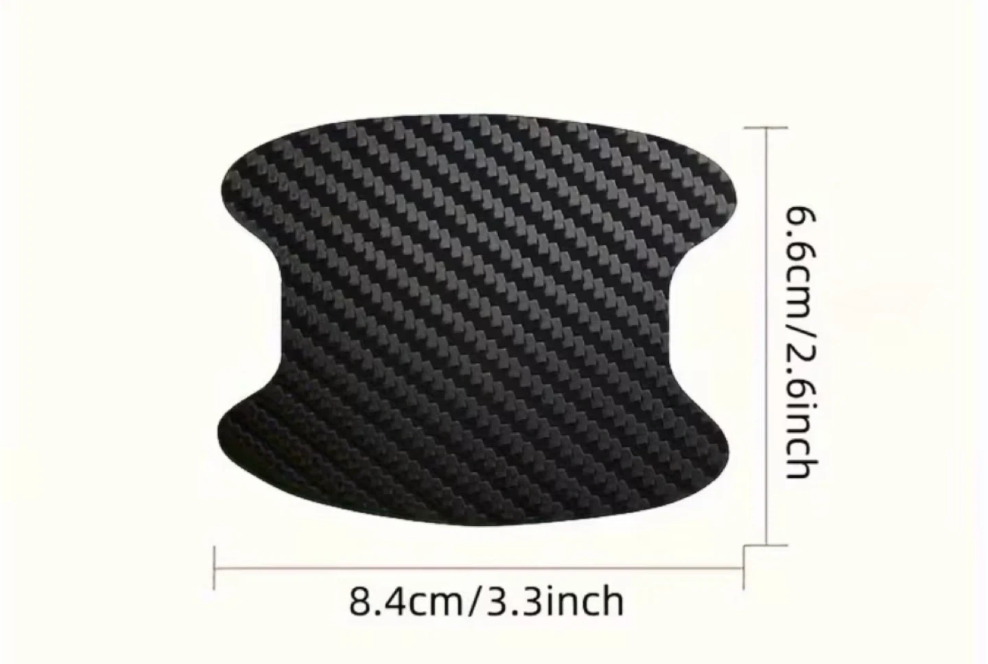 These carbon fiber style stickers protect your car's door handles from scratches. They're easy to apply with their adhesive backing. Each sticker measures approximately 8.4cm by 6.6cm. Protects your paint finish!