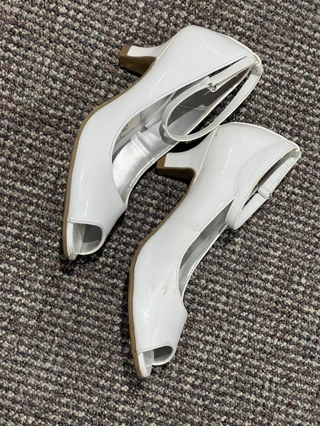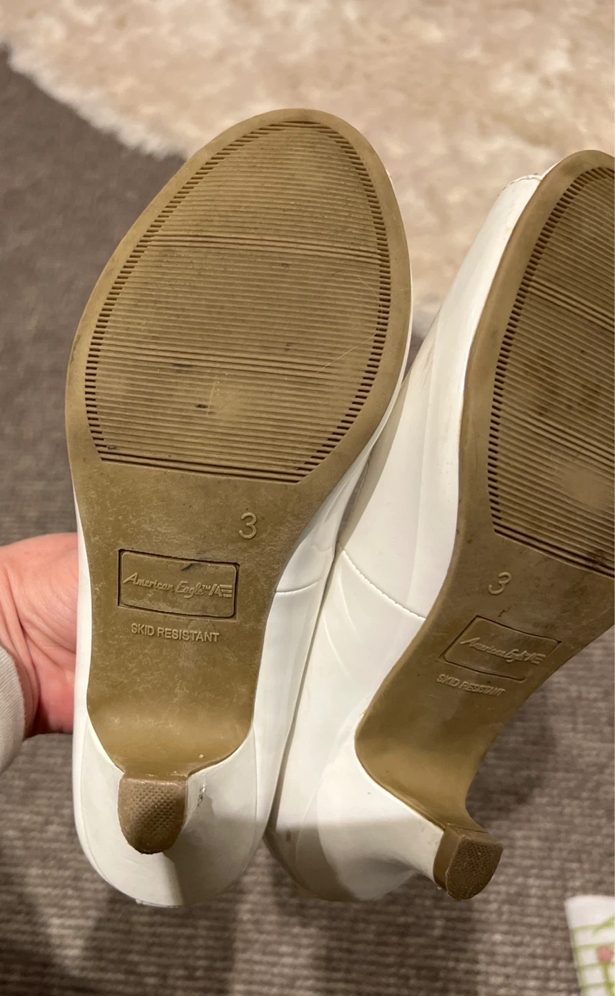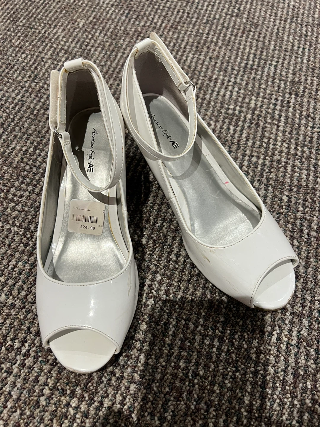 A pair of American Eagle white heels in size 3. They have a cute peep-toe design and ankle strap. There are some signs of wear, as shown in the photos.