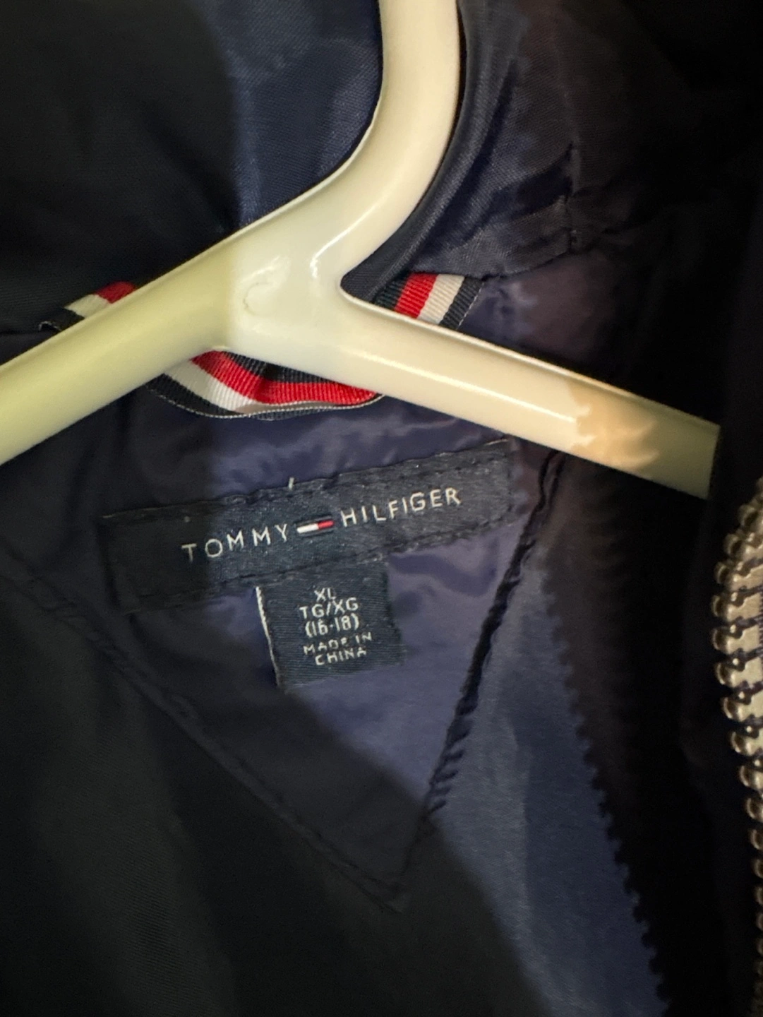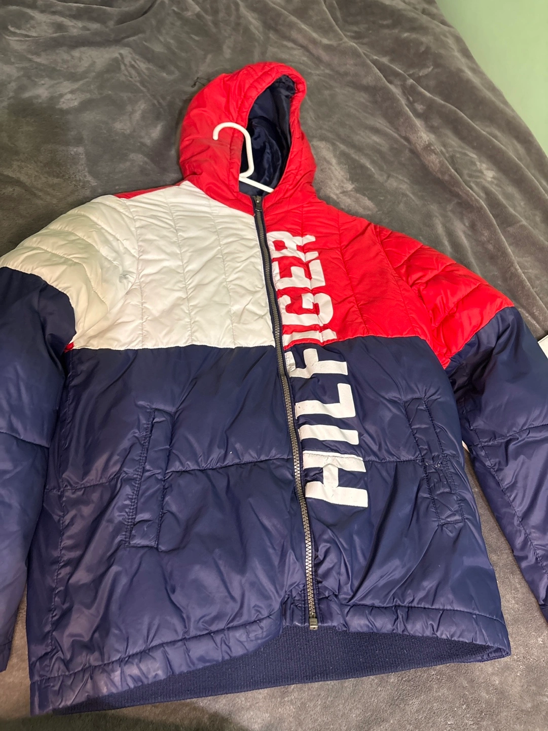 Men's Tommy Hilfiger puffer jacket. Colour-block design. Features a hood and zipper closure. Size XL. Made in China.
