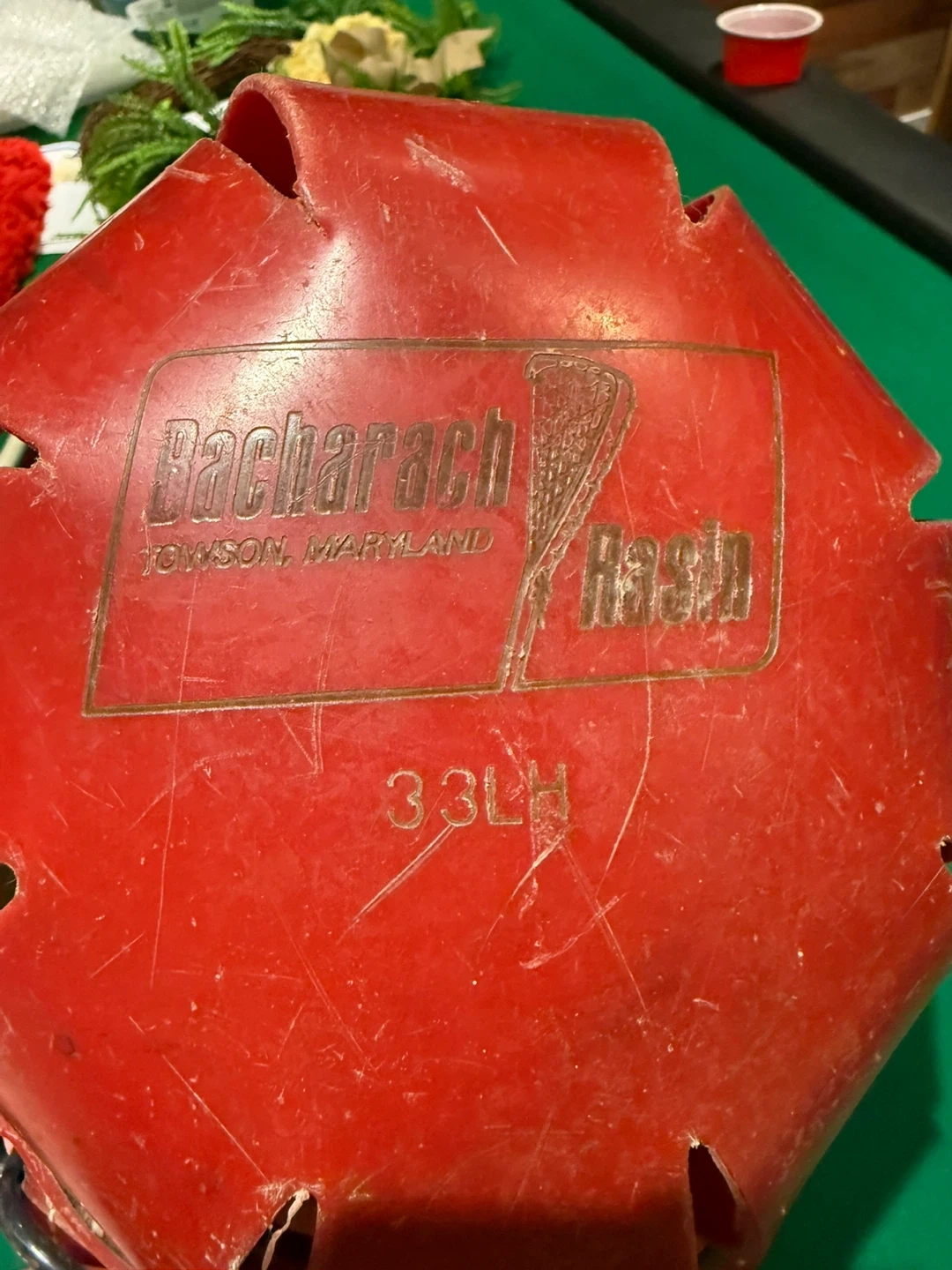 Vintage red lacrosse helmet by Bacharach. It's labelled 'Bash' and has '33LH' printed on it. The inside lining shows signs of wear, consistent with its age. This mask is a piece of lacrosse history!