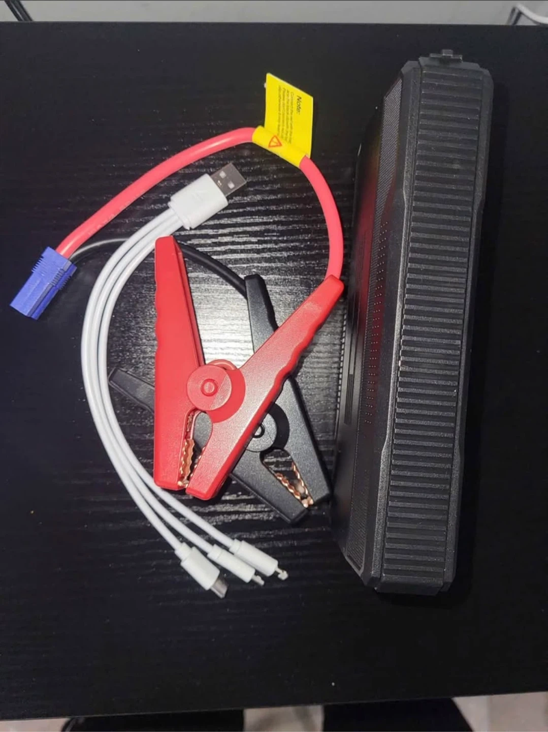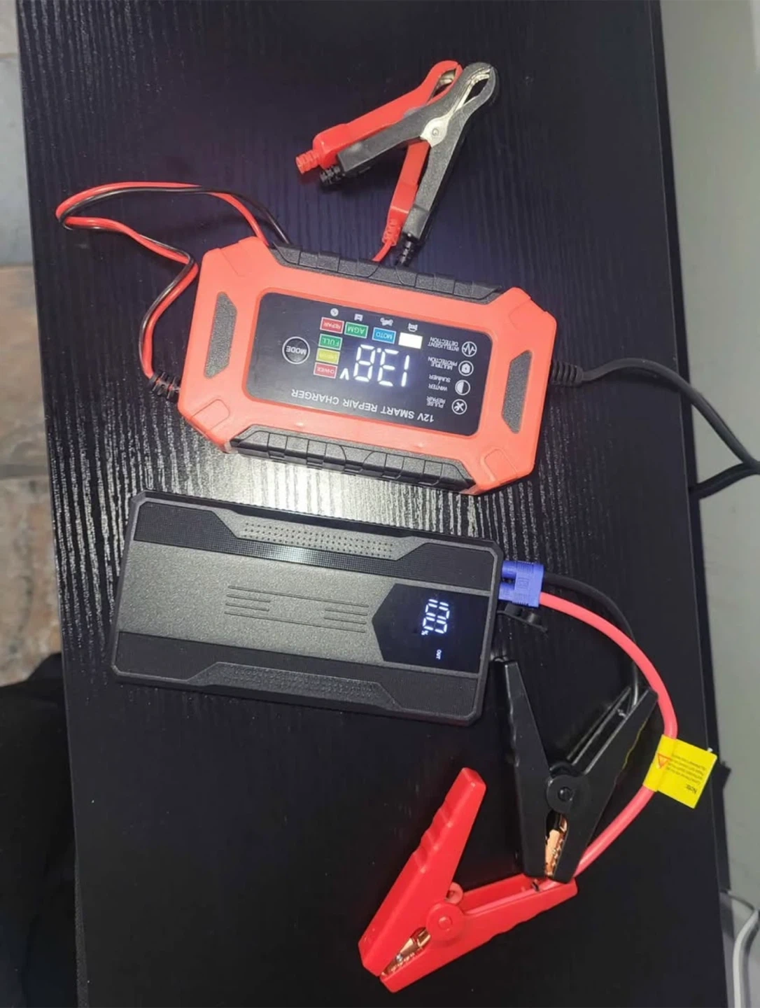 Selling a 12V smart repair charger and jump starter. It comes with all the necessary cables and clamps for easy use. Great for cars, motorcycles, and more! It also has multiple intelligent protection features.