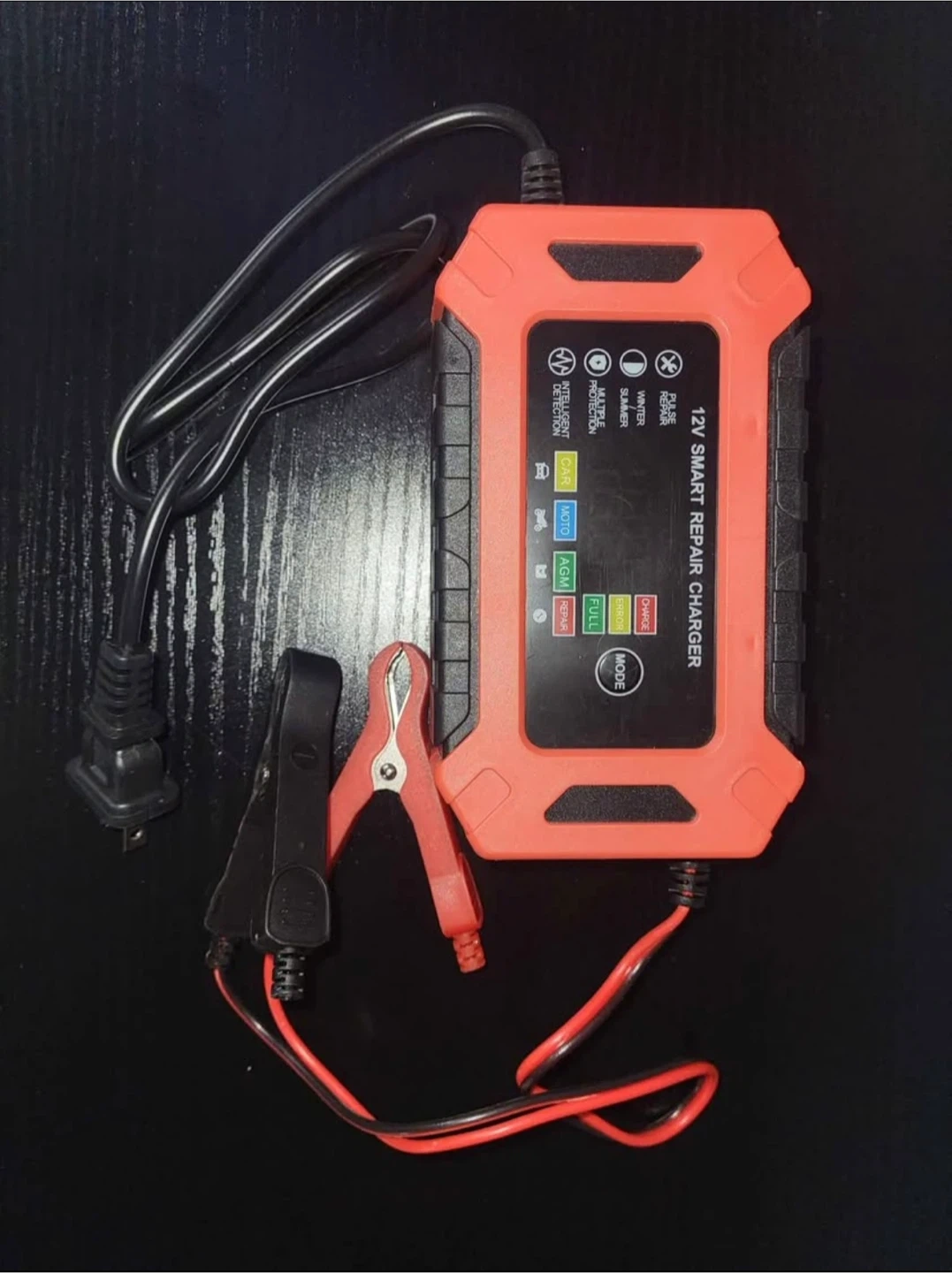 Selling a 12V smart repair charger and jump starter. It comes with all the necessary cables and clamps for easy use. Great for cars, motorcycles, and more! It also has multiple intelligent protection features.