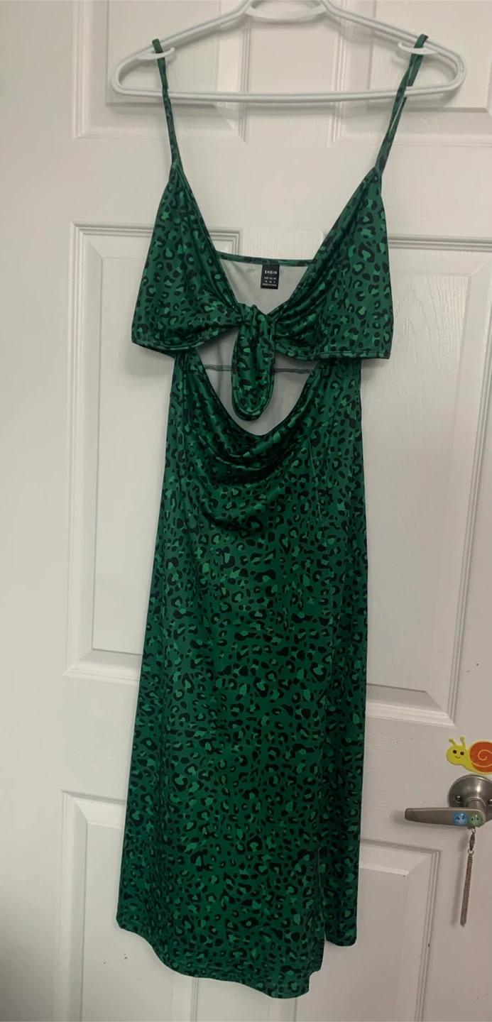 This SHEIN midi dress features a vibrant green and black leopard print with a flattering cutout design and a tie front detail. It's made of a stretchy material for comfort. The spaghetti straps make it a great option for warmer weather!