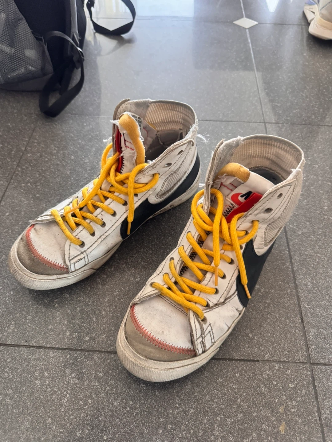 Nike Blazer Mid '77 Vintage high top sneakers in white with black accents. These kicks show signs of wear but still have plenty of life left! Great for casual everyday wear.