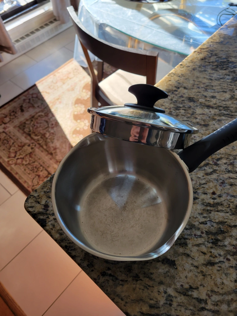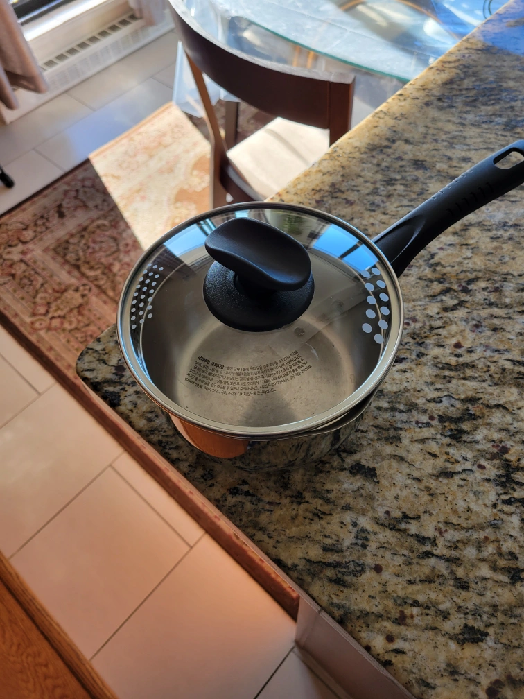 Stainless steel saucepan. Two-quart capacity. Glass lid with steam vent. Black long handle.