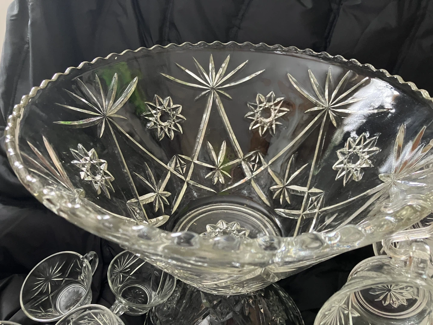 beautiful Early American Prescut Crystal punch set! punch bowl with base and matching cups. set is in great condition and comes with the original box.