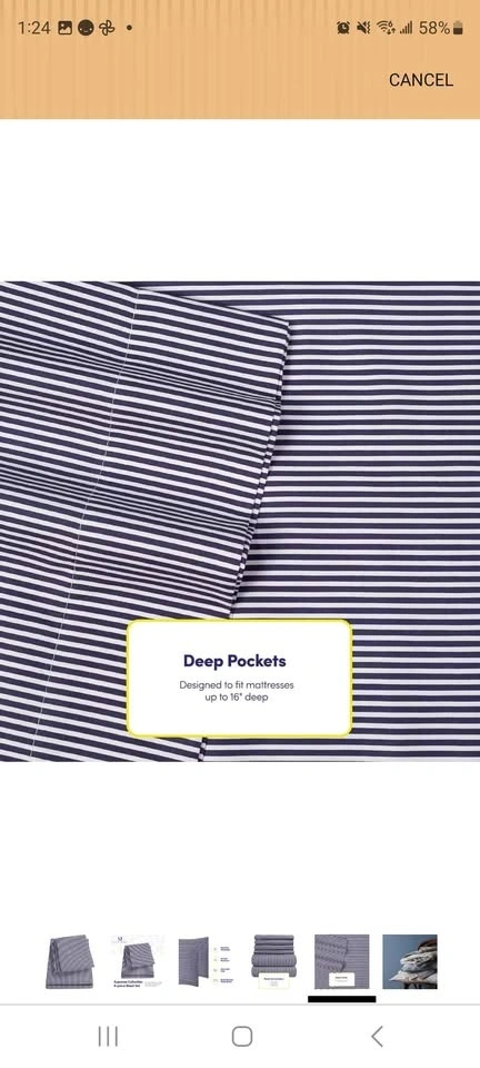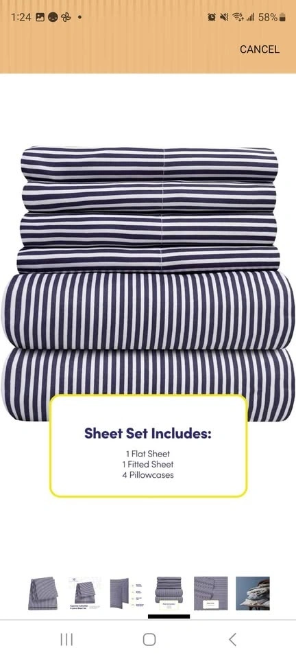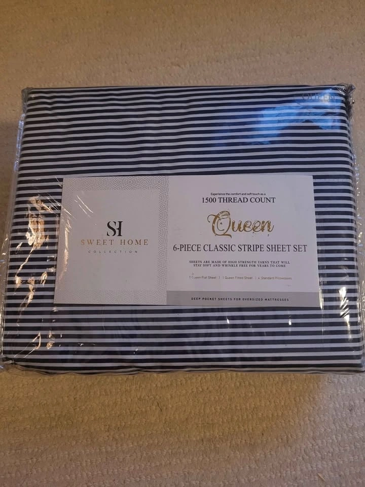 Brand new Sweet Home Collection queen sheet set. This is a 6-piece classic navy and white stripe pattern. Has 1500 thread count fine microfiber material. Comes with 1 flat sheet, 1 fitted sheet, and 4 pillowcases. Deep pockets for oversized mattresses. Machine washable, wrinkle resistant, and ultra soft feel. Regular Price: $42.99. Pick up in lobby near Yonge and Sheppard. Cash only.