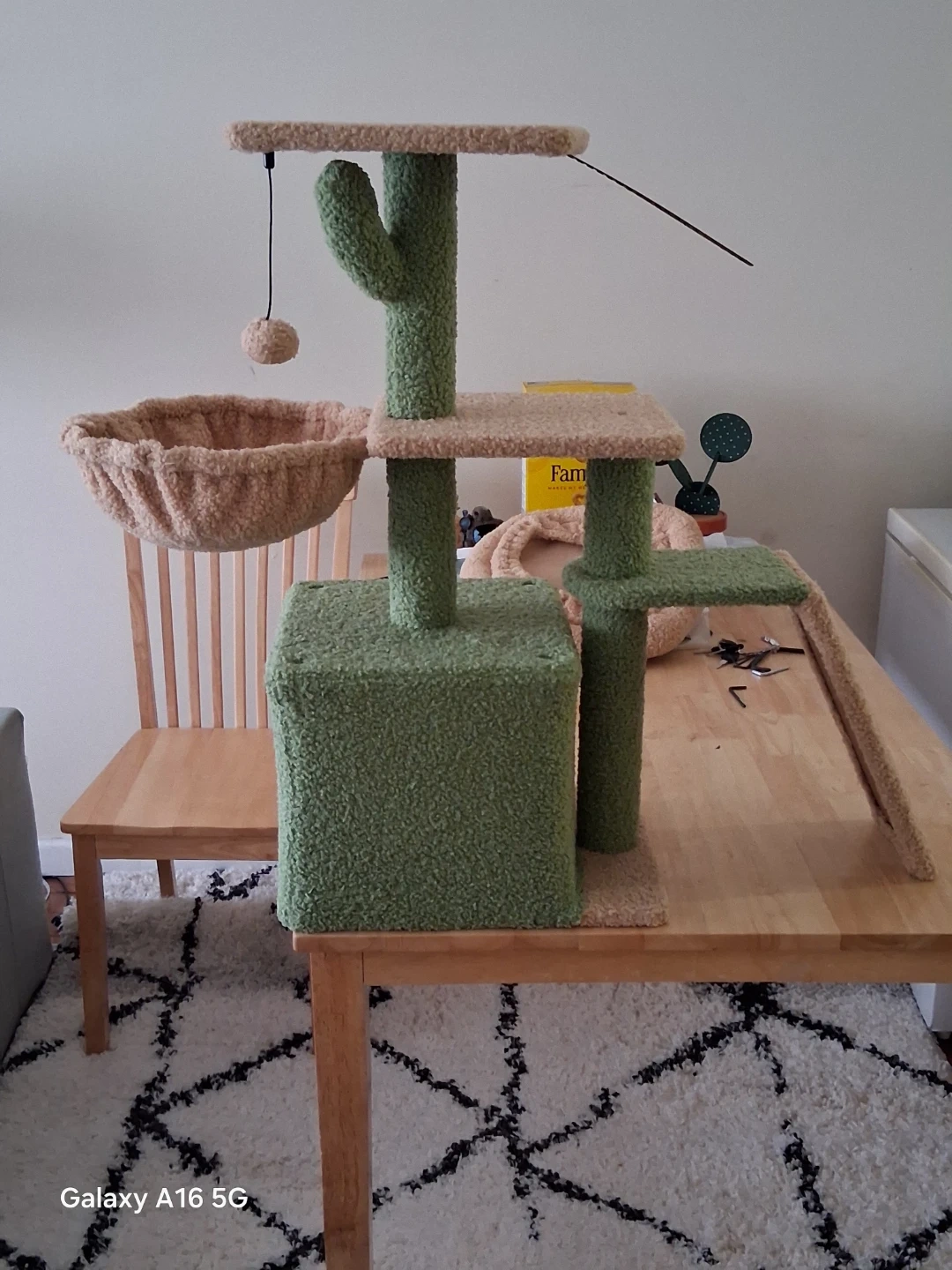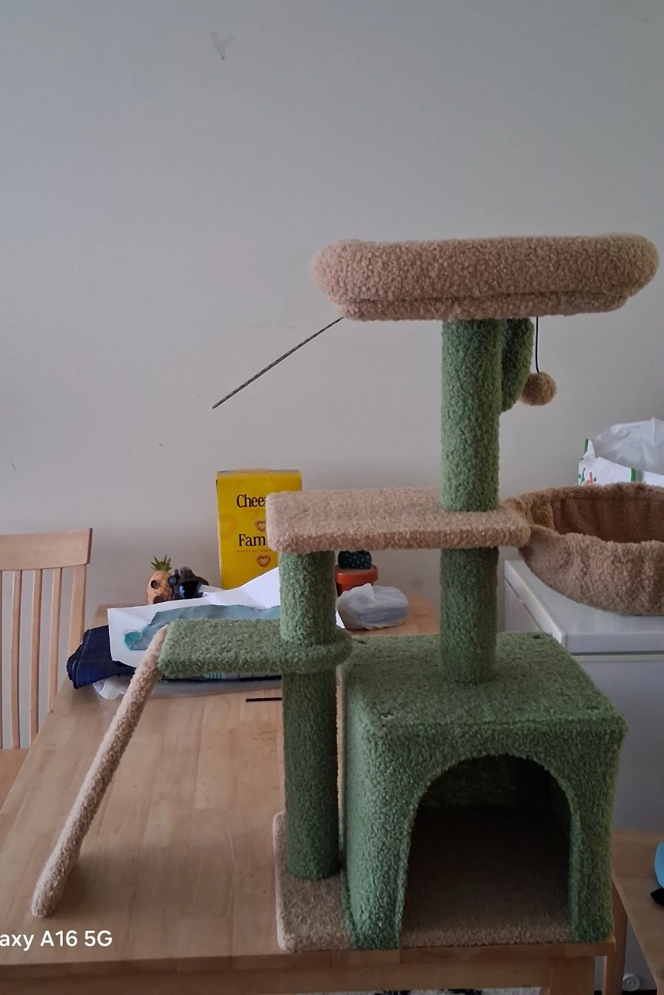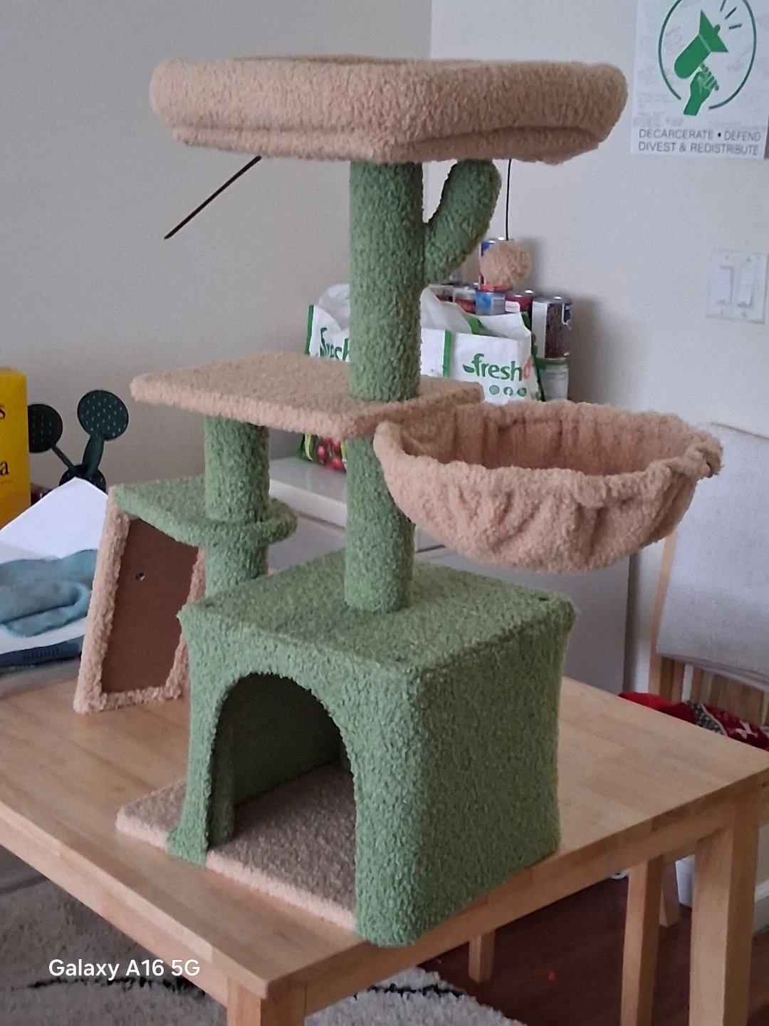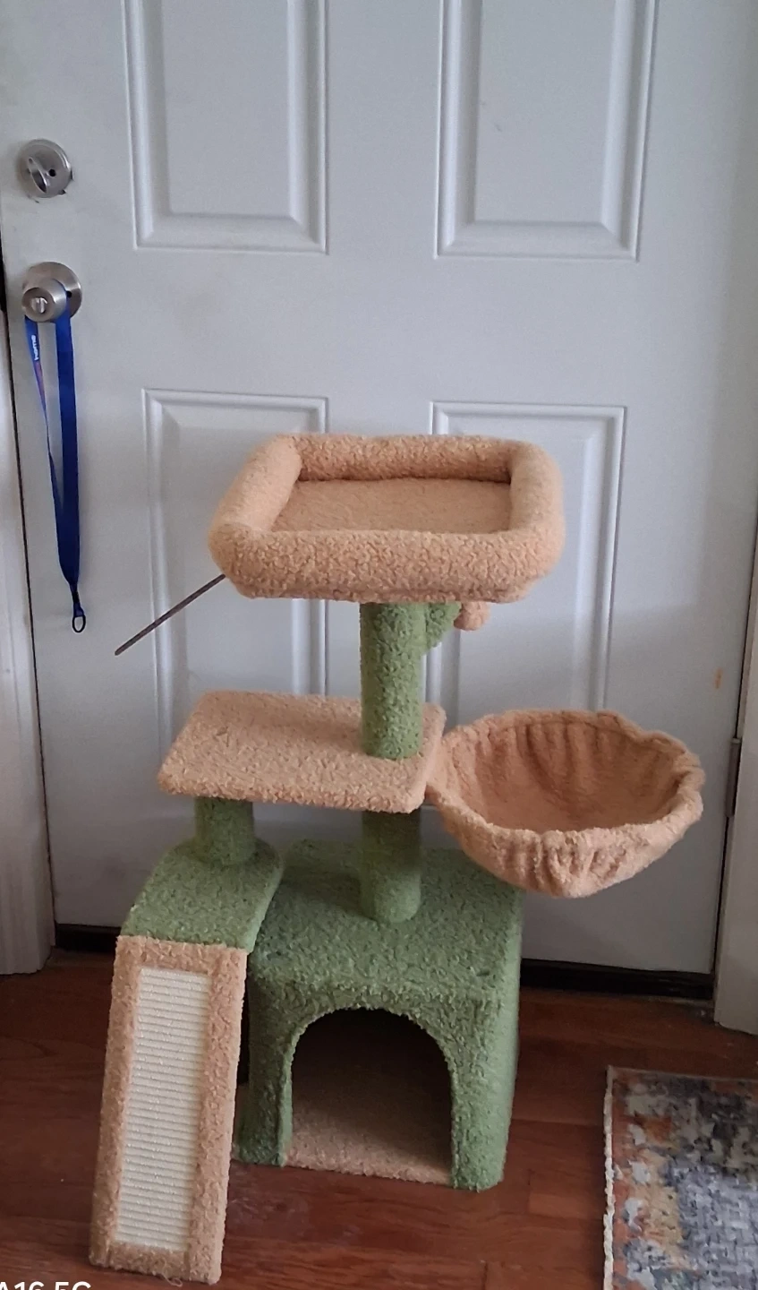 This sturdy cat tree offers multiple levels for your feline friends to climb, perch, and play. It includes scratching surfaces to satisfy their natural instincts and a cozy hideaway. Plush, fuzzy material covers the structure for comfort.