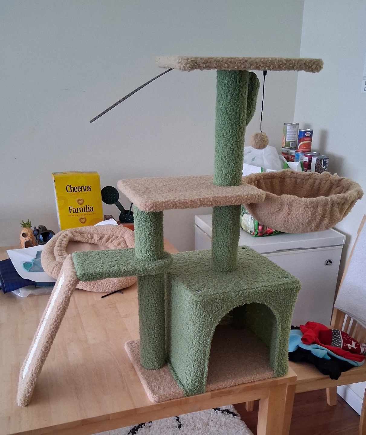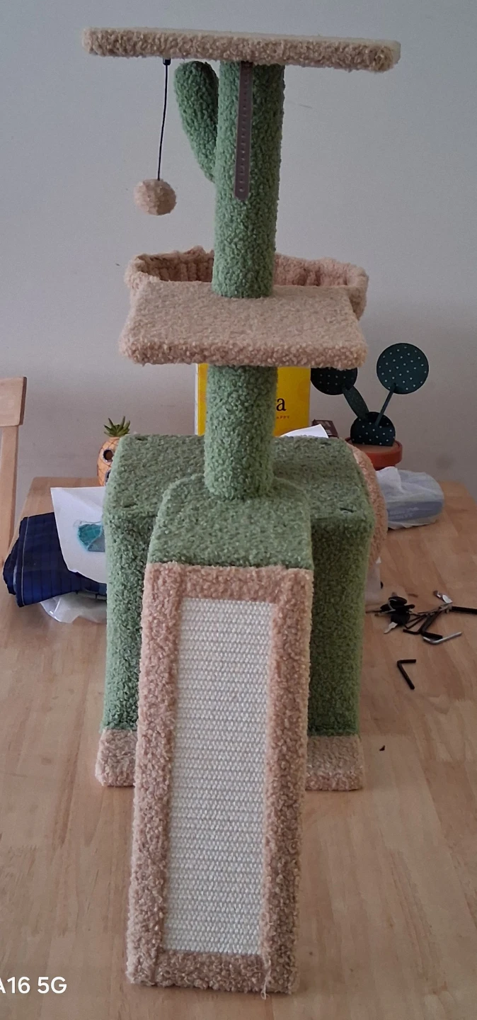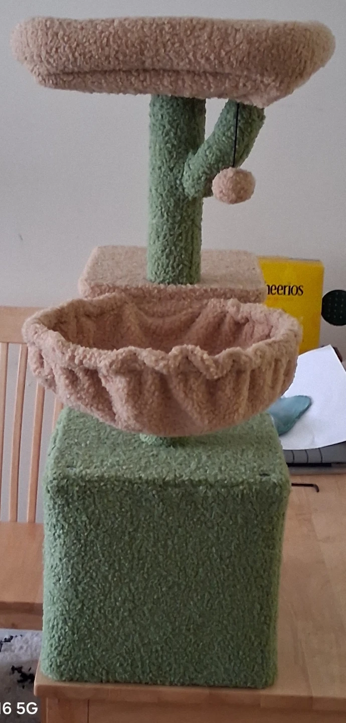 This sturdy cat tree offers multiple levels for your feline friends to climb, perch, and play. It includes scratching surfaces to satisfy their natural instincts and a cozy hideaway. Plush, fuzzy material covers the structure for comfort.