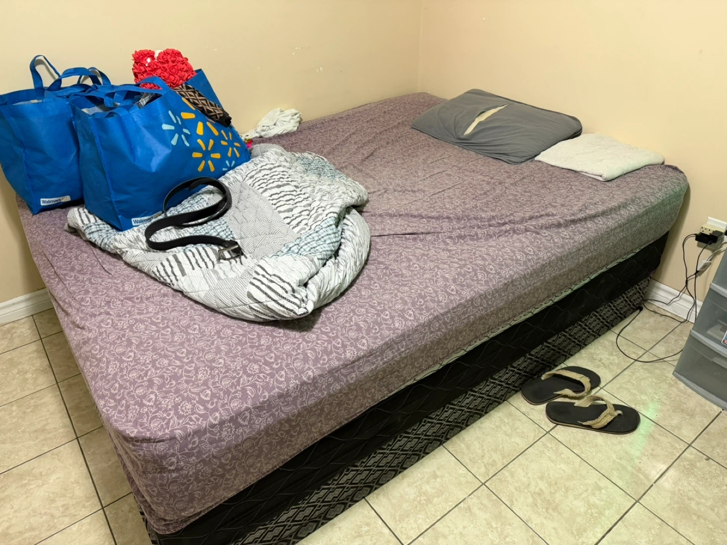 Queen size mattress with a purple floral patterned cover. It's a two-piece box spring and mattress set. Includes two pillows and a folded duvet.