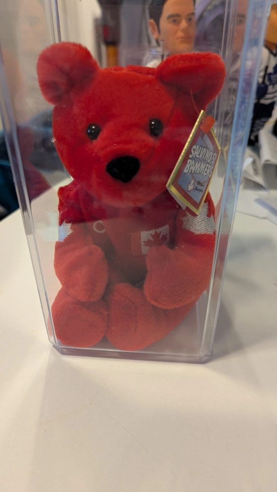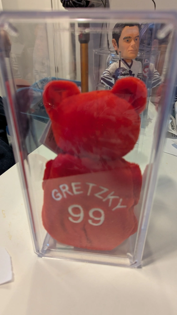 Red collectible teddy bear. Wearing a jersey with Gretzky 99 on the back and the Canadian flag on the front. In a protective plastic case.