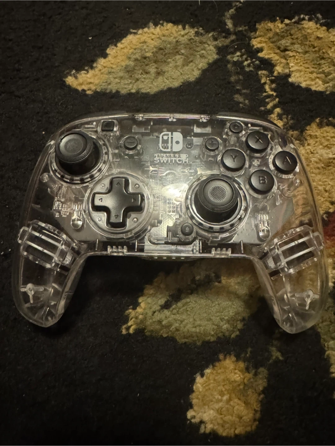 This is a clear Nintendo Switch Pro Controller. It offers a unique look with its transparent casing, allowing you to see the internal components. The controller provides a comfortable grip and responsive buttons for an enhanced gaming experience. Has RGB can change different modes