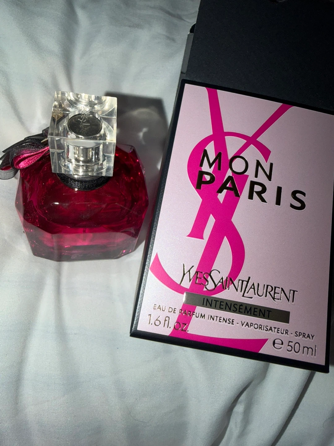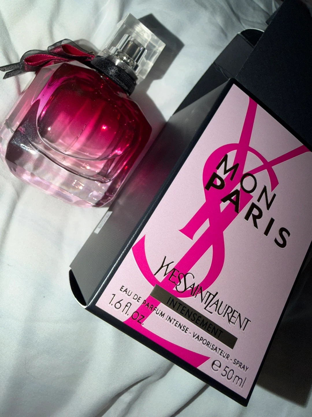 This is a 50ml bottle of Yves Saint Laurent Mon Paris Eau de Parfum Intense spray. It's a captivating fragrance designed for women. The scent is vibrant and sensual.