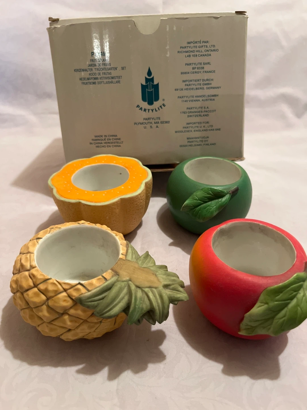 Selling a set of four Vintage Partylite candle holders shaped like different fruits: a cantaloupe a green apple, a red apple, and a pineapple ceramic