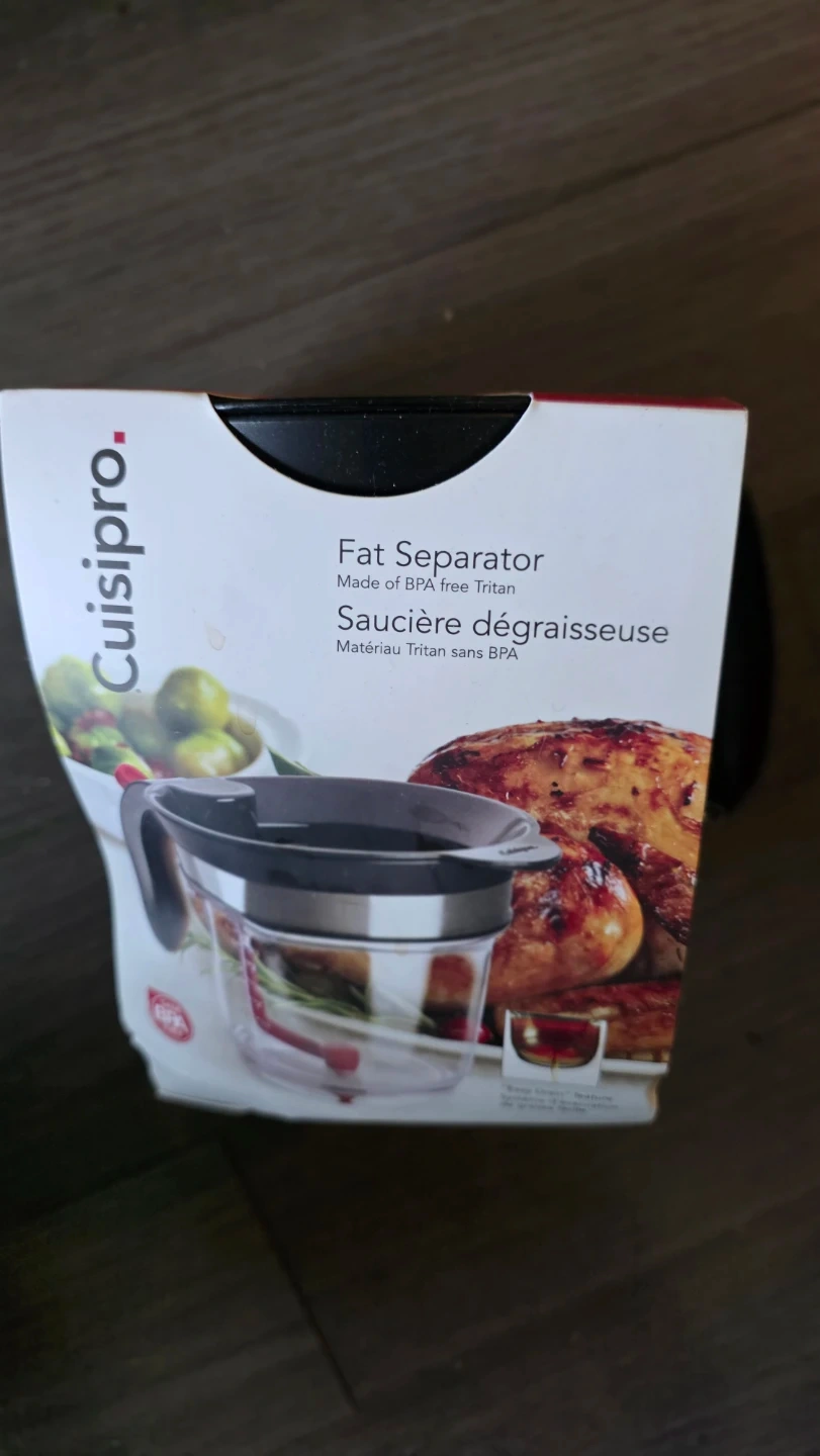 I'm selling a Cuisipro Fat Separator! It's made of BPA-free Tritan and has an 'Easy Drain' feature. It's easy to disassemble and clean, and the 'Easy Drain' feature effectively separates the fat. It has a 1-litre capacity and comes with an oversized straining basket