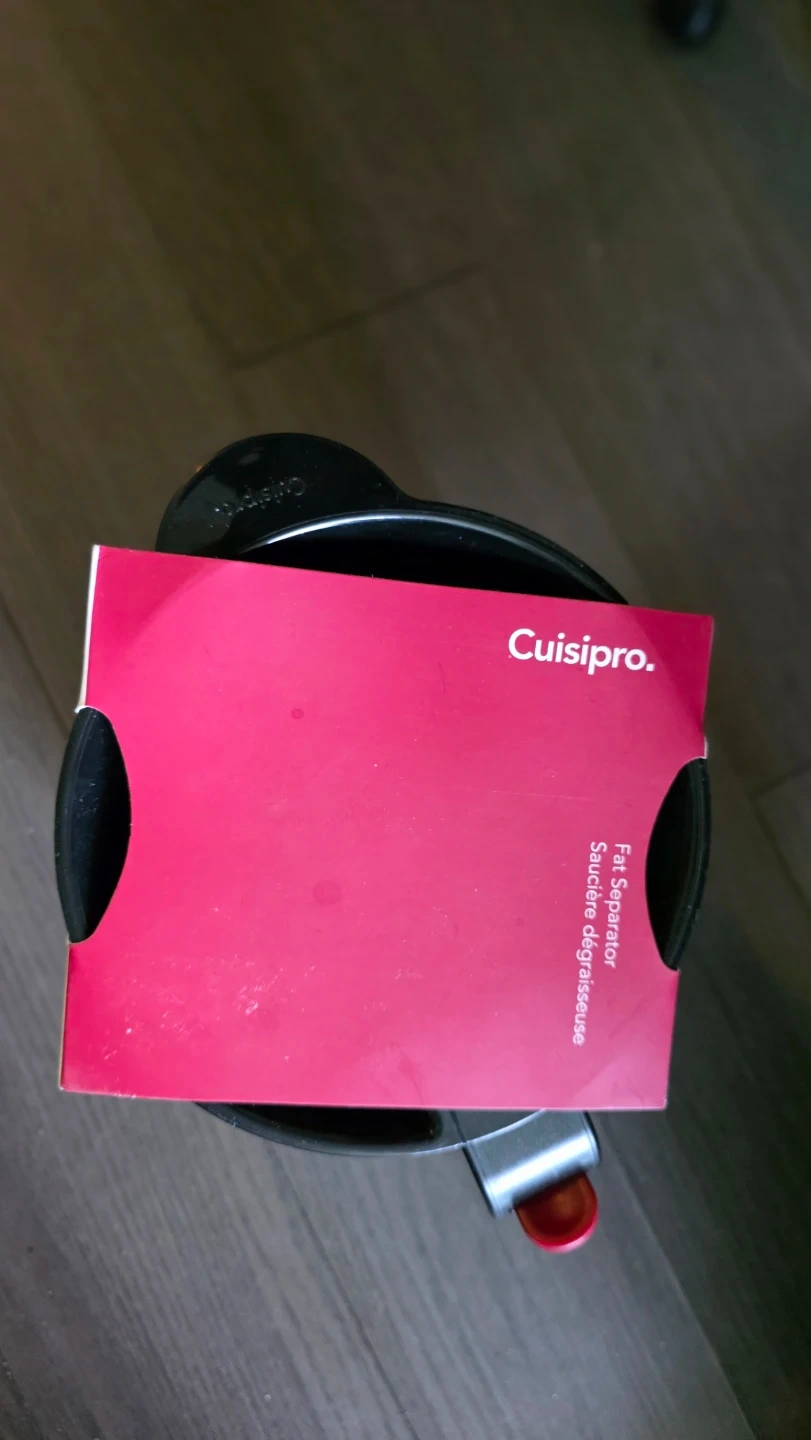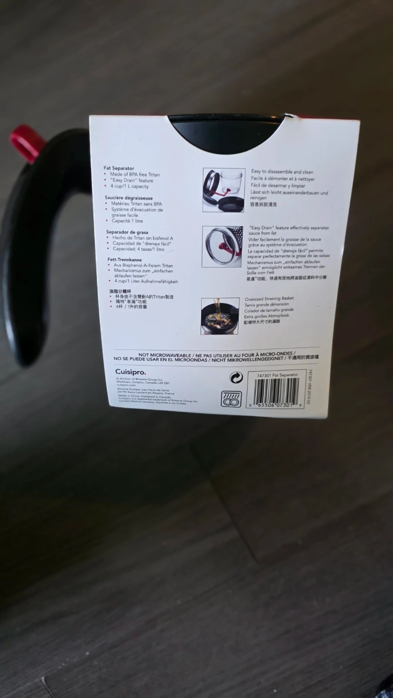 I'm selling a Cuisipro Fat Separator! It's made of BPA-free Tritan and has an 'Easy Drain' feature. It's easy to disassemble and clean, and the 'Easy Drain' feature effectively separates the fat. It has a 1-litre capacity and comes with an oversized straining basket