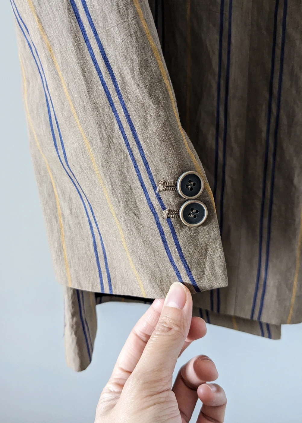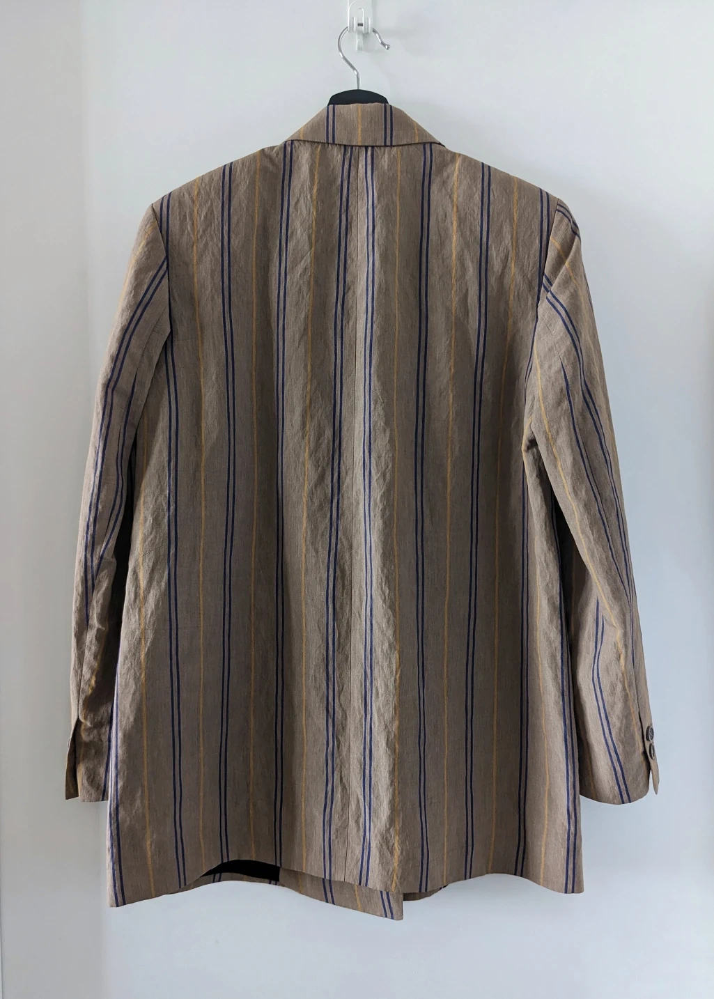 It has two fake pockets on the front, and double-breasted button closure. The cool-toned Brown fabric is accented with Blue and Yellow pinstripes. The shoulders have very subtle padding sewn in, giving you a more structured look overall.