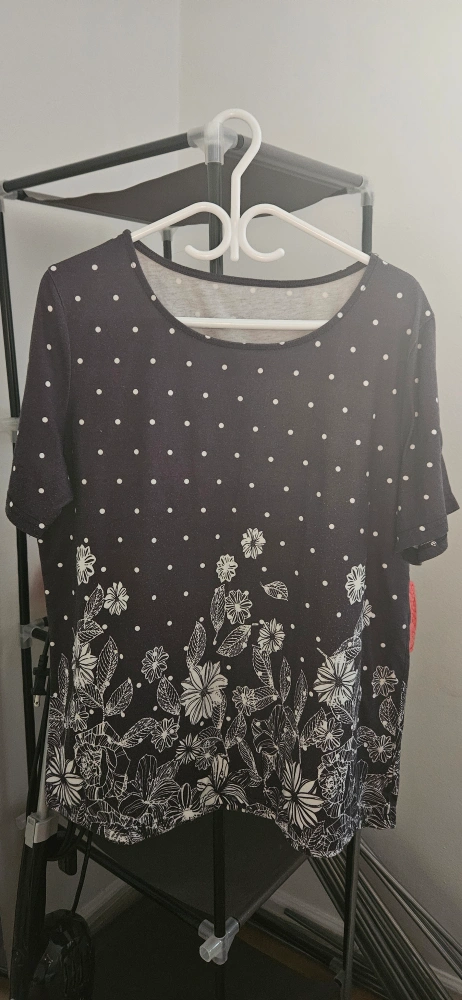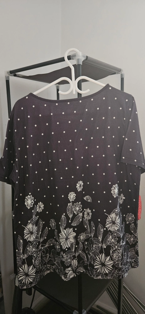 A cute floral print top in size XL! It features a black background with white polka dots and a floral design at the bottom. Perfect for adding a touch of style to your wardrobe