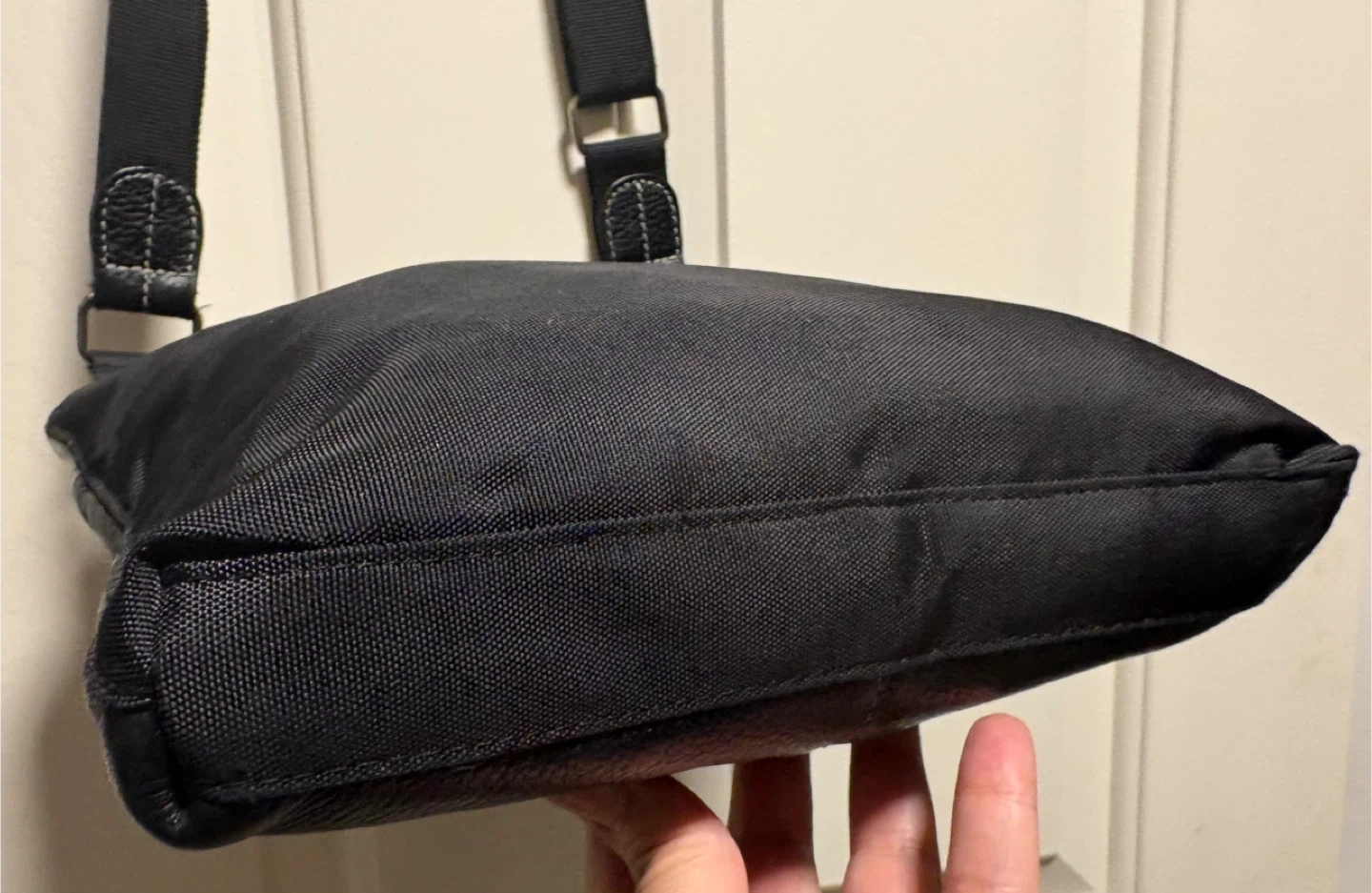 Elegant black leather crossbody bag with embossed Roots logo. Features contrast stitching. Great condition, used only once! Leather on the front, polyester on the back. Awesome bag for travelling, or everyday use. Adjustable strap. Pick up in Chestermere.