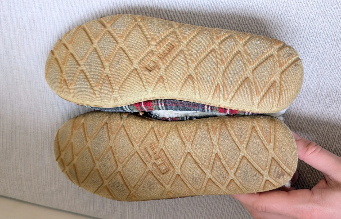 Cozy L.L.Bean moccasin slippers in women's size 9 Medium. They feature a warm fleece lining and a plaid textile upper with a leather tie detail. The rubber sole offers good traction.