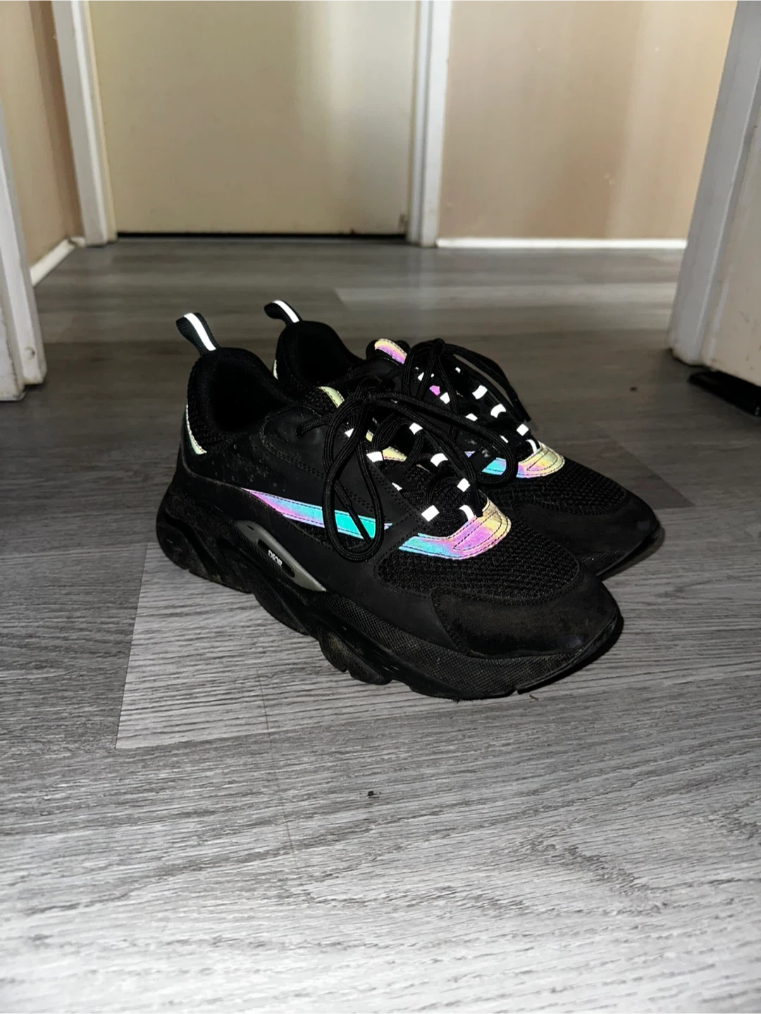 These Dior B23 sneakers are black. They're made with mesh and leather accents. These kicks are great for everyday wear!