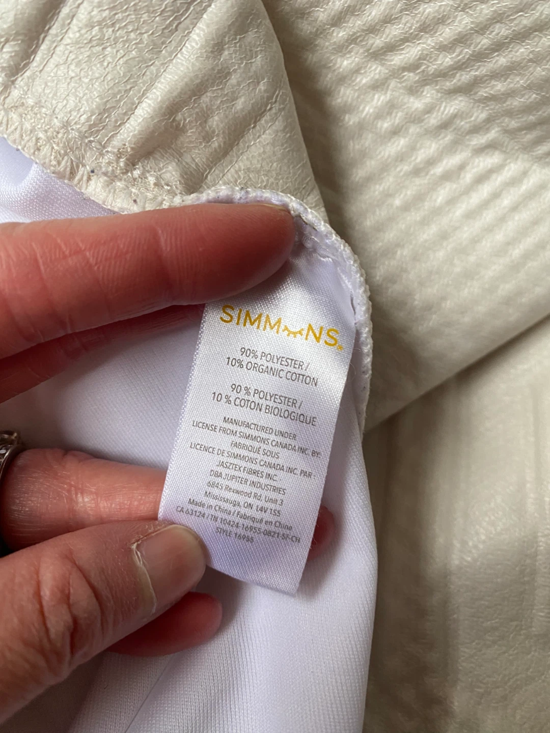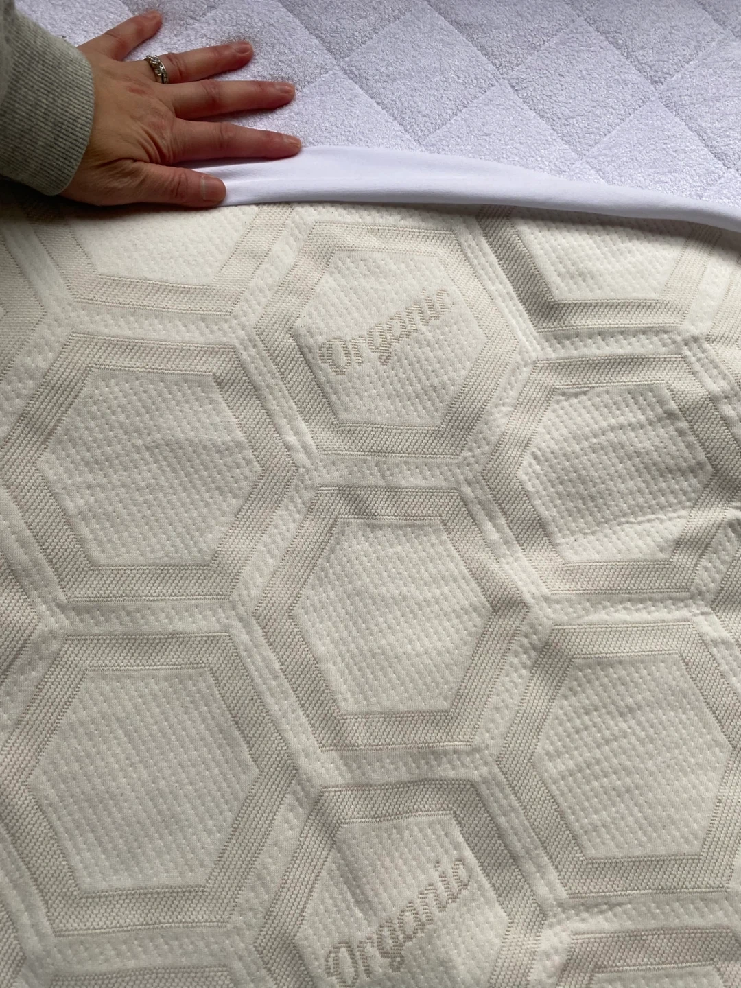 Images 3 to 5 are Simmons mattress protector with a honeycomb organic cotton pattern. It's made with 90% polyester and 10% organic cotton. Machine washable and durable for easy care.
