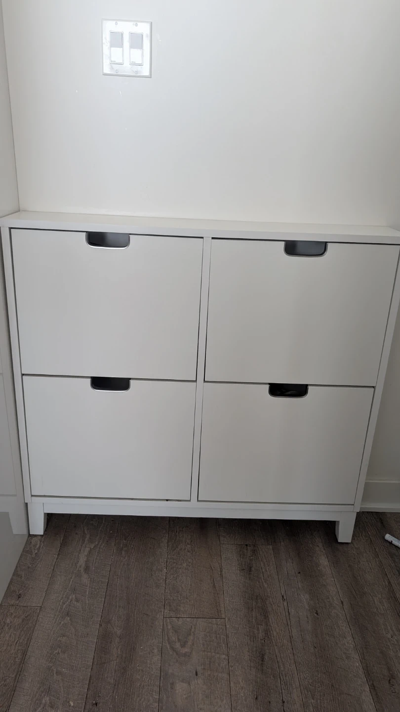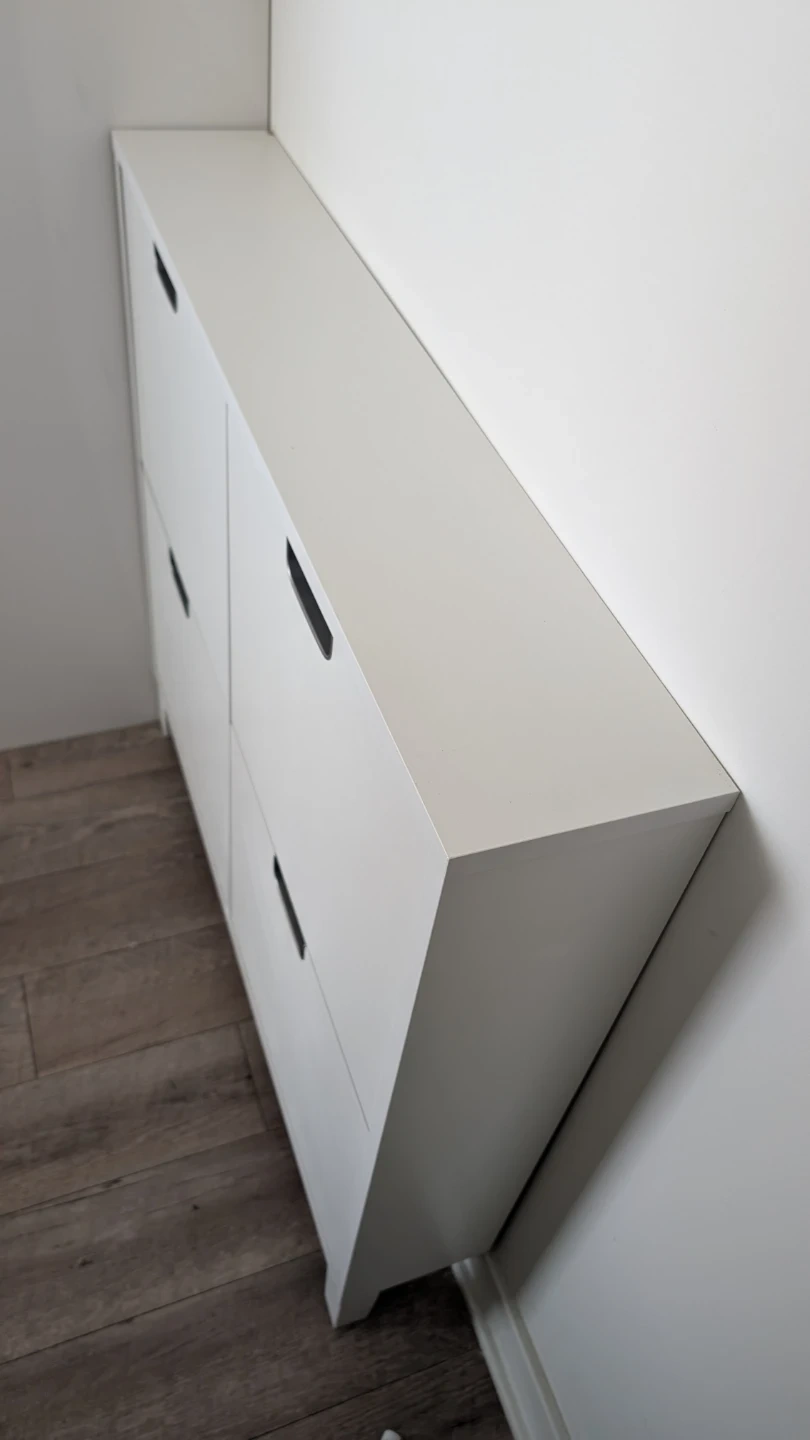 White shoe cabinet with four flip-out drawers. Fits nicely into hallways or entryways. Width is 96 cm, depth 17 cm, and height 90 cm. Keeps footwear tidy!
