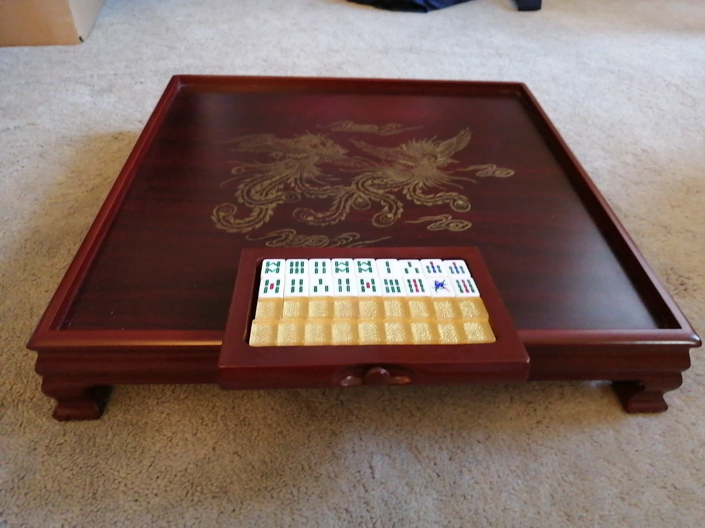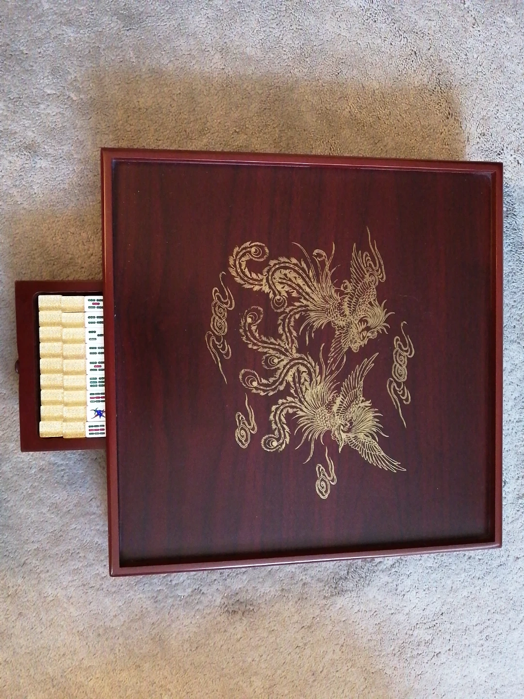 Mahjong set featuring decorative tiles and a beautifully crafted wooden tray with a dragon design. It's ready for your next game night!