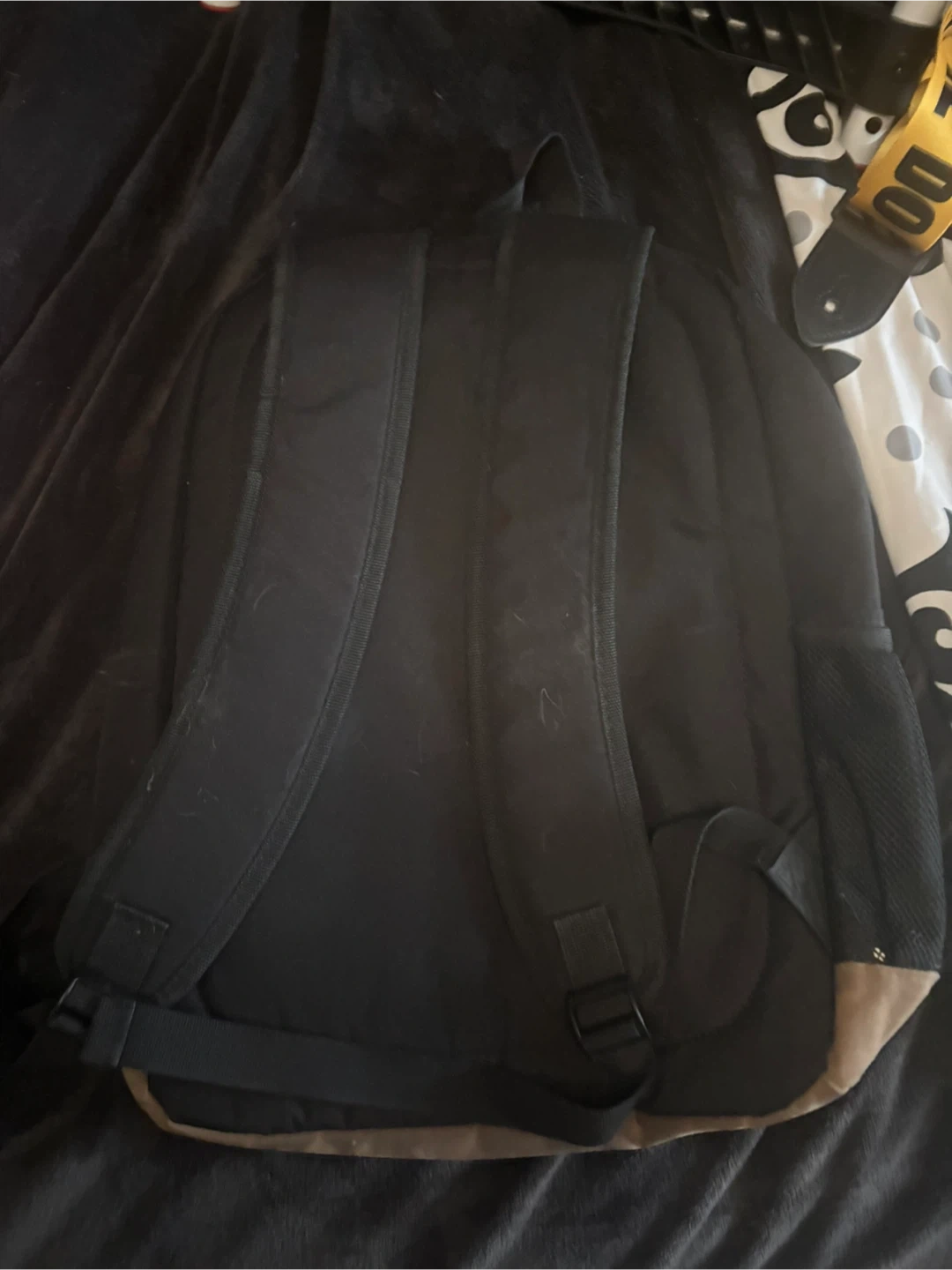 Black backpack with tan accents. Features a 'Canada Since 1967' emblem. It has adjustable straps and multiple pockets. Plenty of space for your gear or school supplies!