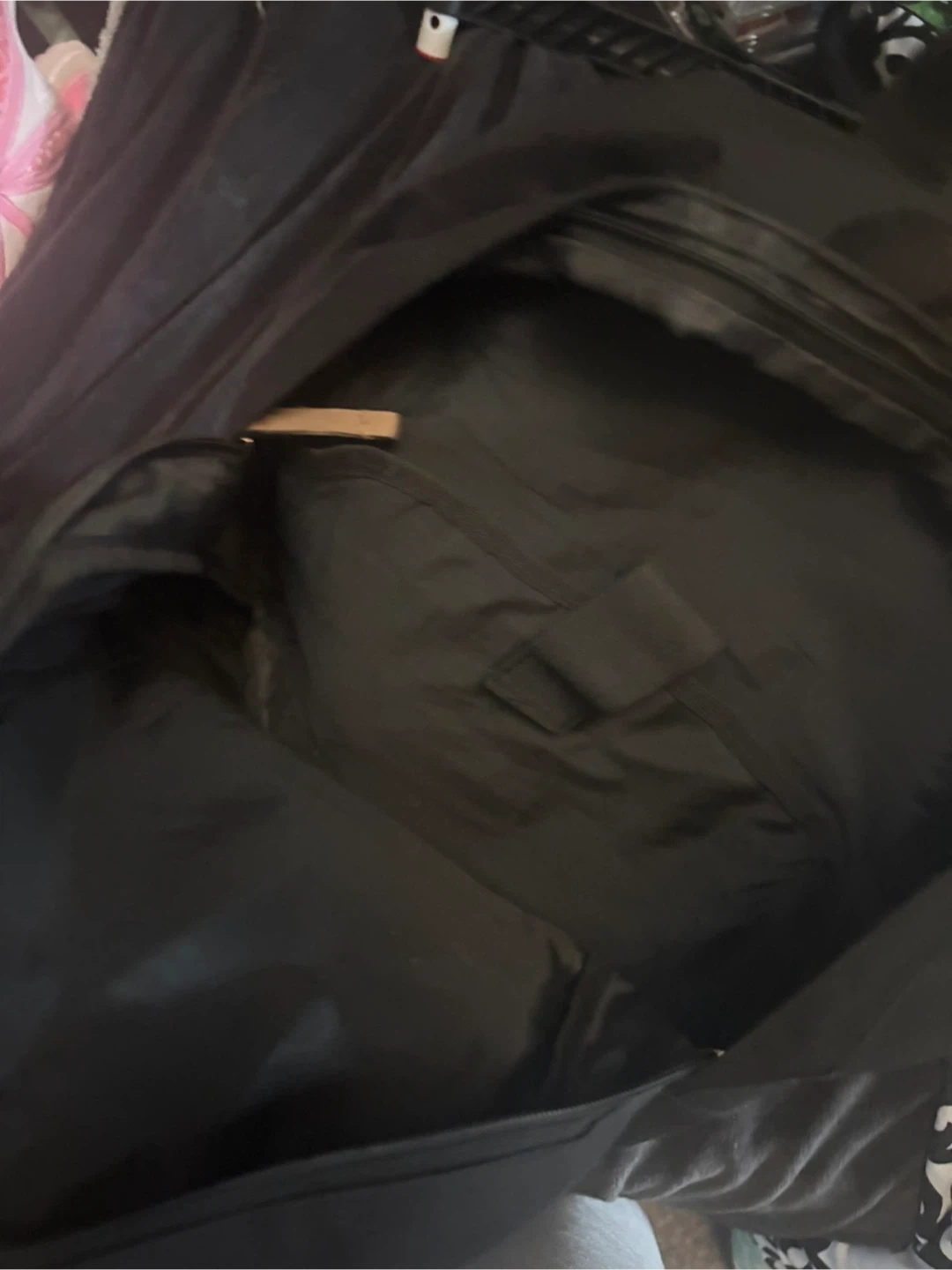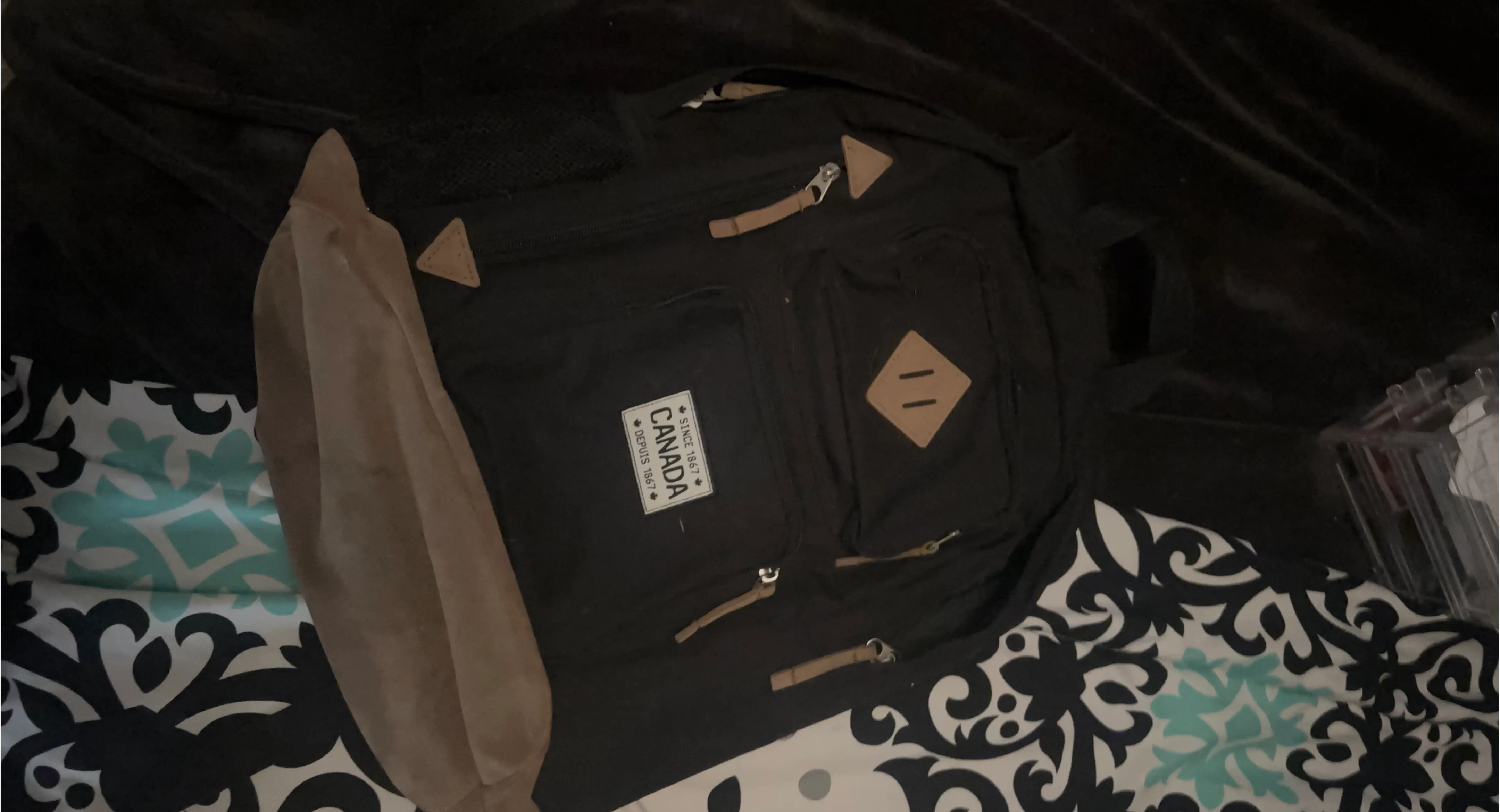 Black backpack with tan accents. Features a 'Canada Since 1967' emblem. It has adjustable straps and multiple pockets. Plenty of space for your gear or school supplies!