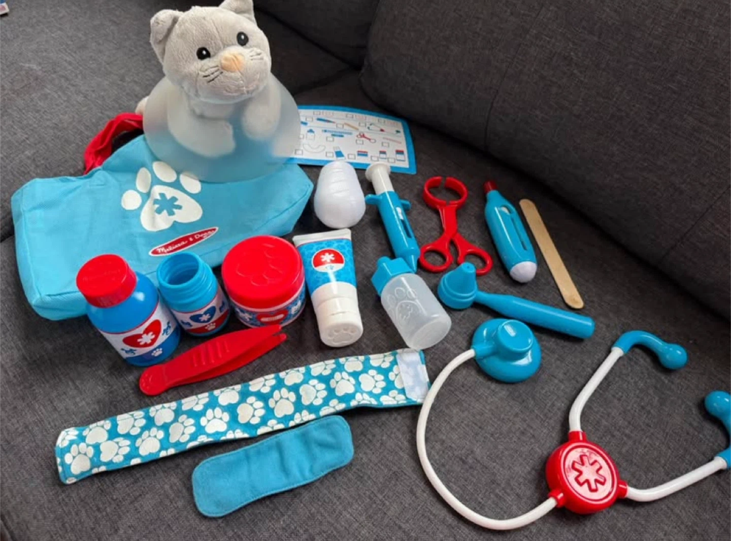 This Melissa & Doug Pet Vet Play Set includes a plush cat and various vet tools. It comes with a bag, stethoscope, pretend medications, and more. Great for role-playing and learning about animal care!