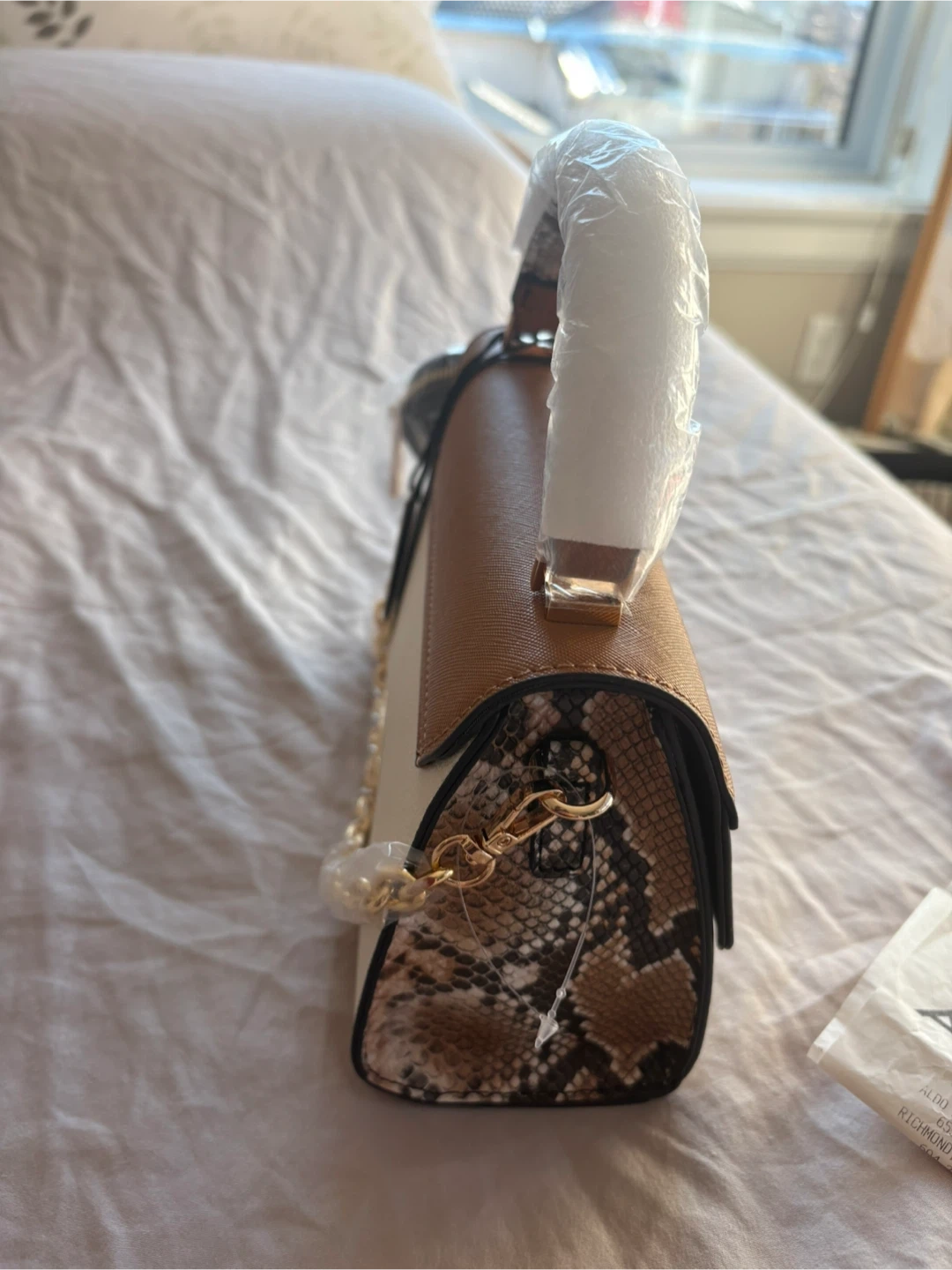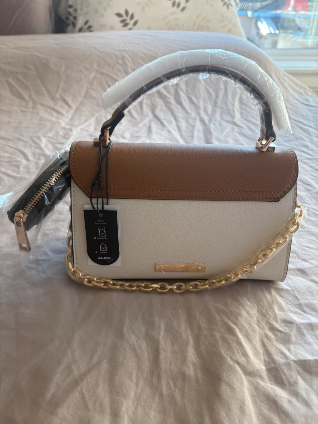 This ALDO satchel handbag features a tri-colour design with brown, white, and black panels. It has a gold-tone chain strap and a top handle. The interior includes a smaller zip pouch. It's brand new with tags still attached!