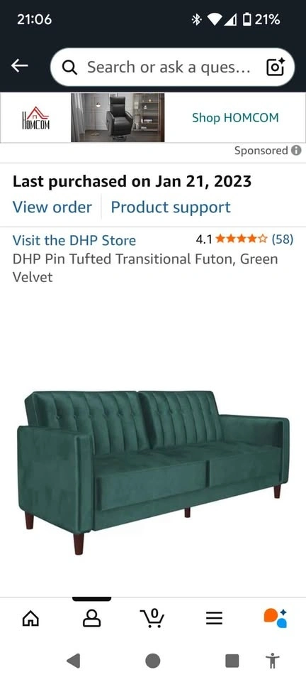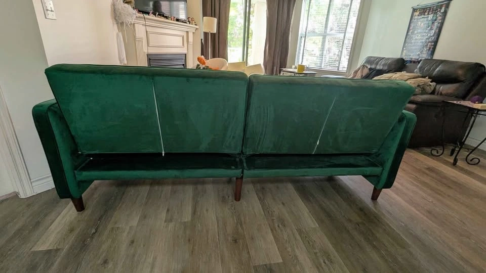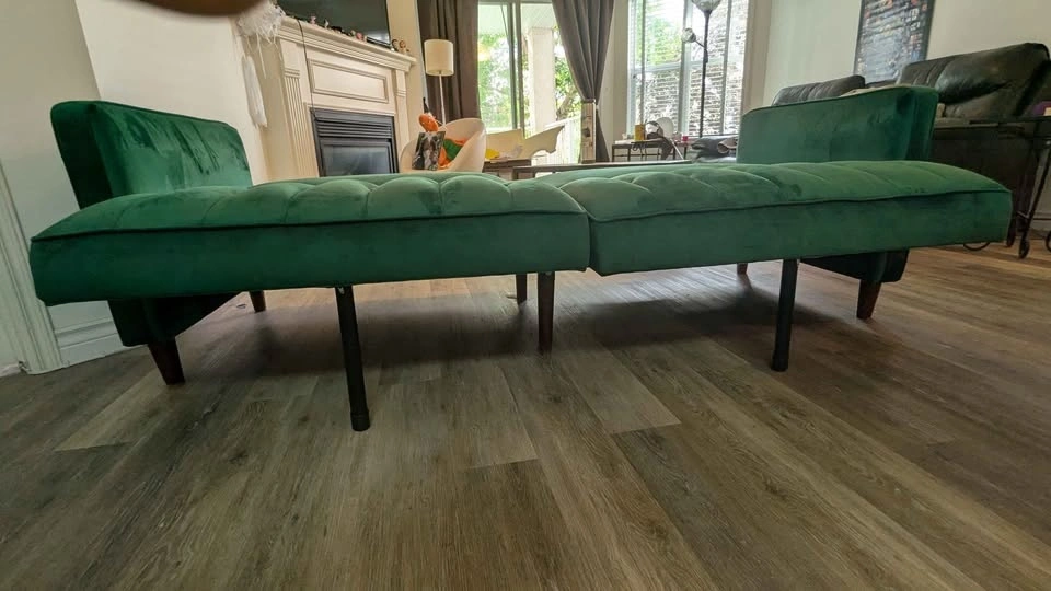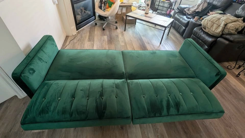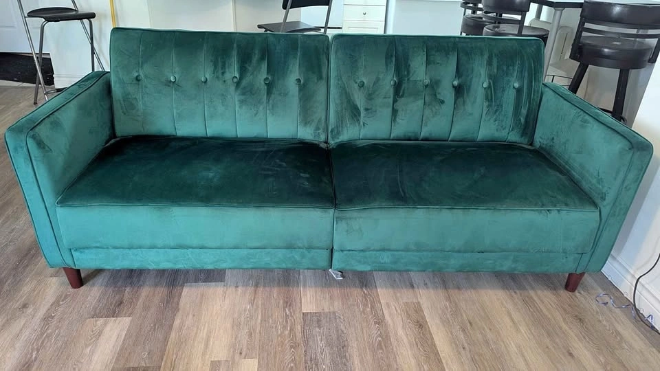DPH branded Pin Tufted Transitional Futon in Green Velvet. Used for one year. It folds into a bed. Original price was $689.99 from Amazon. Selling because I had to move to a smaller place. It's been very well maintained. Dimensions are in the pictures.
