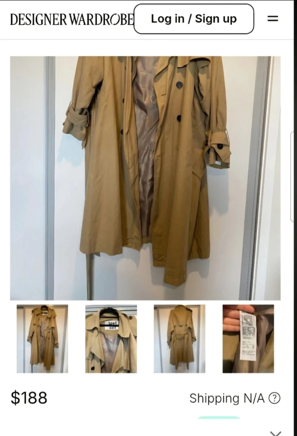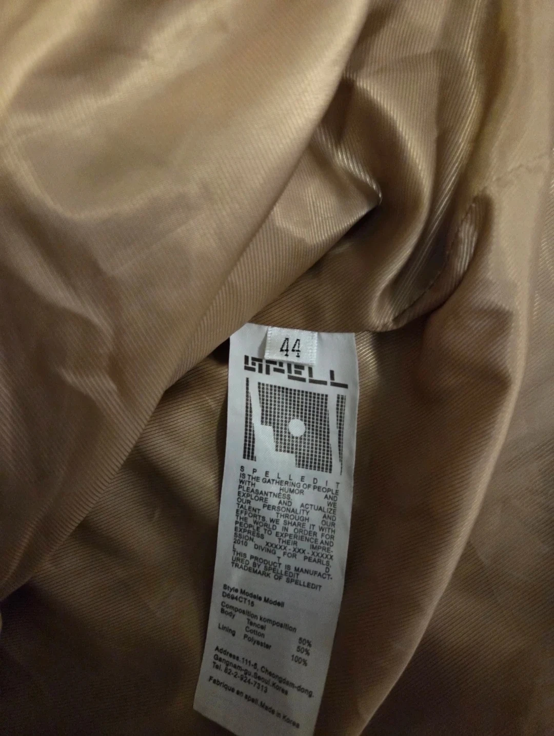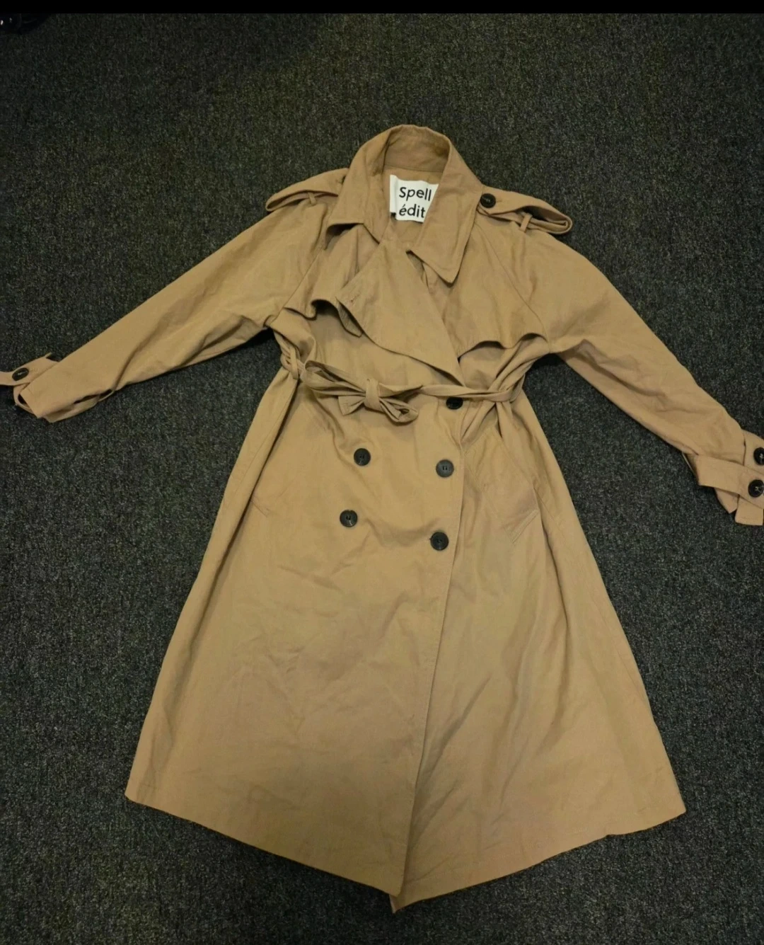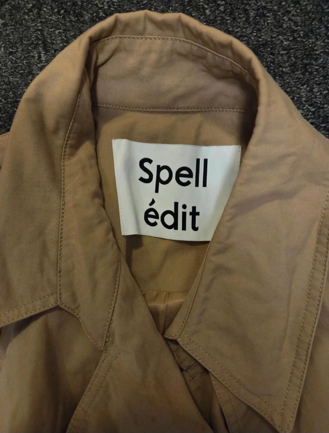 A classic beige trench coat from Spell edit. It's a size 44 with a button-up front and a tie belt. The outer shell is cotton and the lining is polyester.