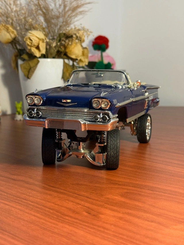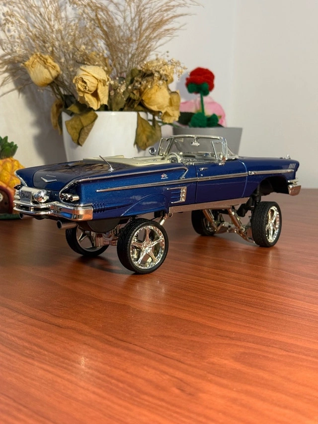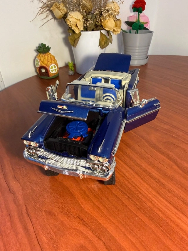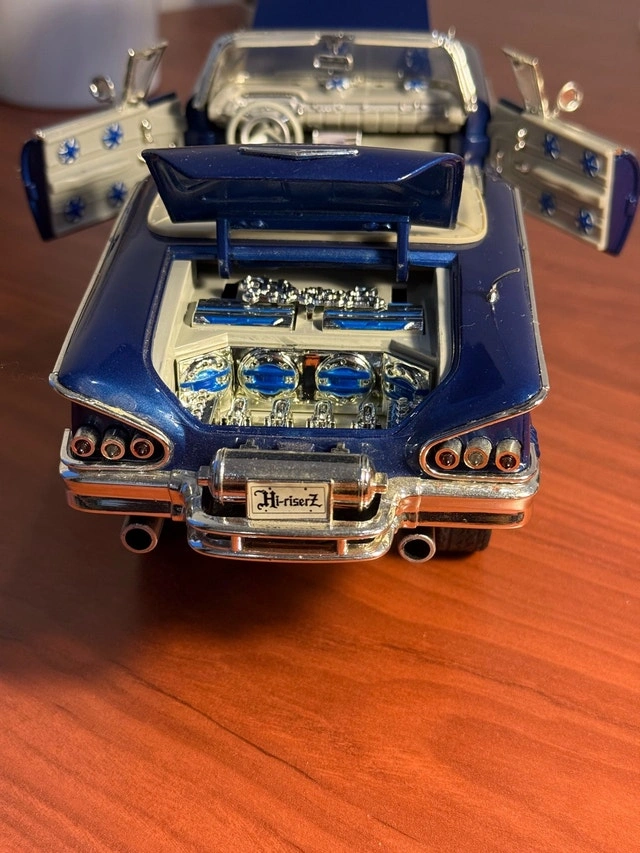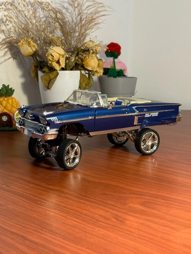 Selling a high-quality 1/18 scale diecast model of a 1958 Chevrolet Impala Convertible. This is the "Hi-Riserz" / "Get On My Level" edition, featuring the iconic "Donk" style with oversized chrome wheels and a raised suspension. Scale: 1/18 (approx. 11-12 inches long). Color: Deep Metallic Blue with white interior. Features "Get On My Level" decals, massive multi-spoke chrome rims, and detailed chrome trim. Diecast metal body with opening doors, hood, and trunk. Excellent condition, displayed in a smoke-free home. No missing mirrors or broken trim. Great piece for collectors of lowriders, donks, or classic American muscle. Pickup near Mavis & Eglinton, Mississauga. Cash or cashless payment accepted.