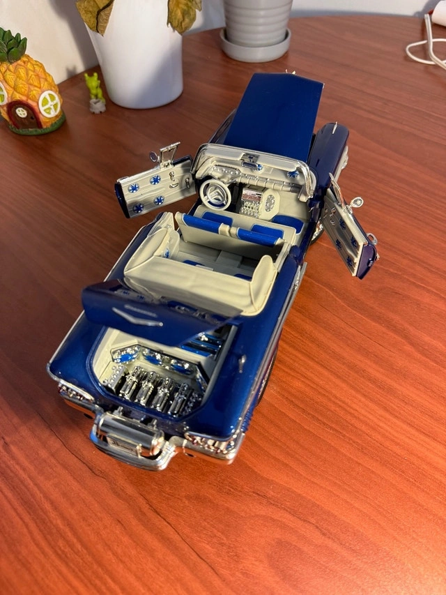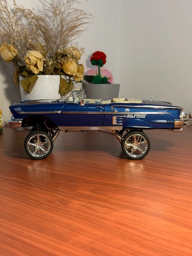 Selling a high-quality 1/18 scale diecast model of a 1958 Chevrolet Impala Convertible. This is the "Hi-Riserz" / "Get On My Level" edition, featuring the iconic "Donk" style with oversized chrome wheels and a raised suspension. Scale: 1/18 (approx. 11-12 inches long). Color: Deep Metallic Blue with white interior. Features "Get On My Level" decals, massive multi-spoke chrome rims, and detailed chrome trim. Diecast metal body with opening doors, hood, and trunk. Excellent condition, displayed in a smoke-free home. No missing mirrors or broken trim. Great piece for collectors of lowriders, donks, or classic American muscle. Pickup near Mavis & Eglinton, Mississauga. Cash or cashless payment accepted.