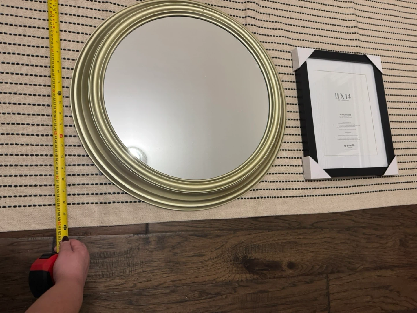 A decorative gold round wall mirror with a wide, fluted frame. It measures approximately 16 inches in diameter. Perfect for adding a touch of elegance to any room!