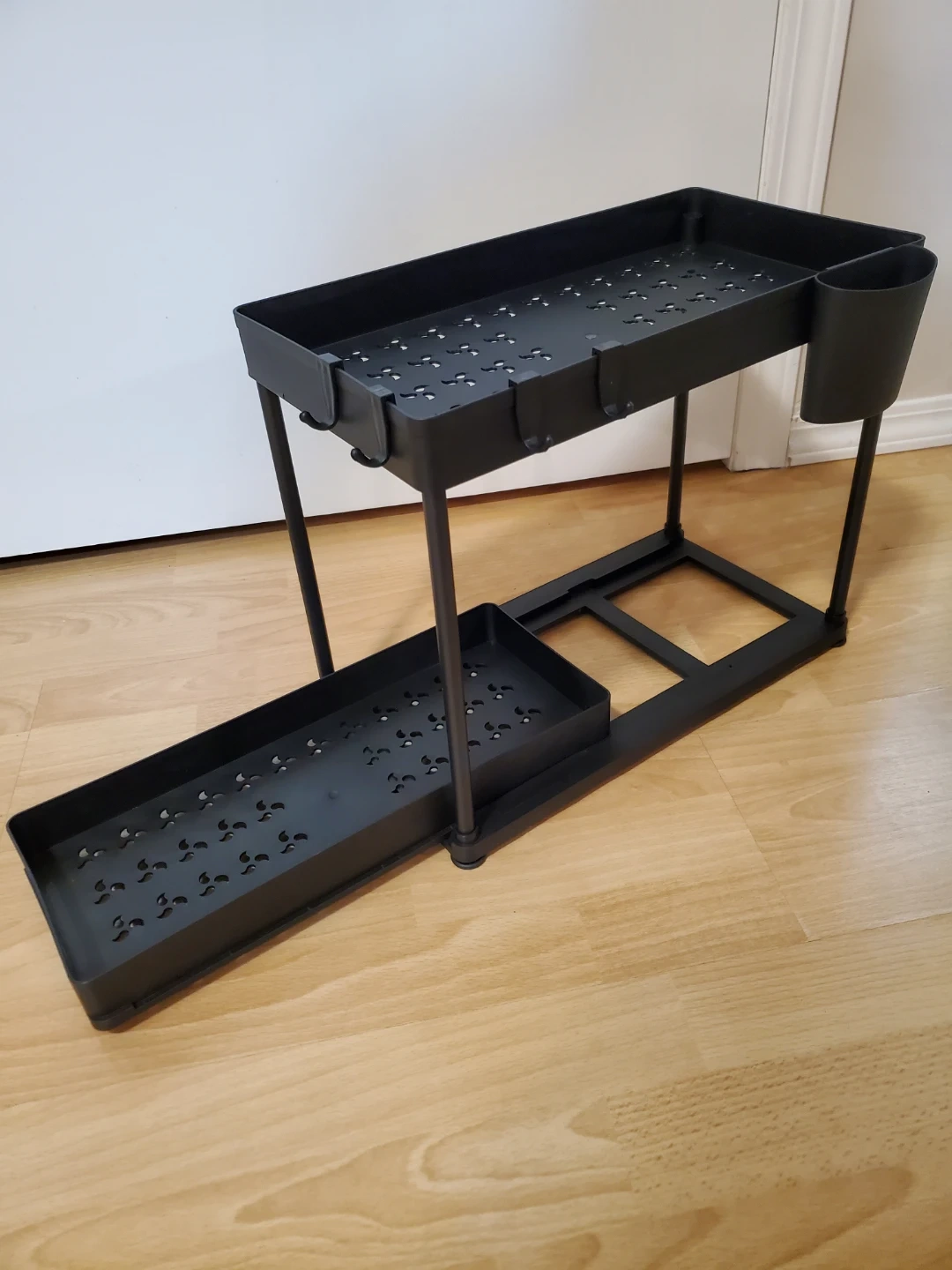 Brand new, never used. This plastic organizer features two tiers and a slide-out drawer for easy access to your cleaning supplies and other essentials. It's a practical solution for maximizing storage space in your bathroom or kitchen. 15 x 8 x 13 inches.