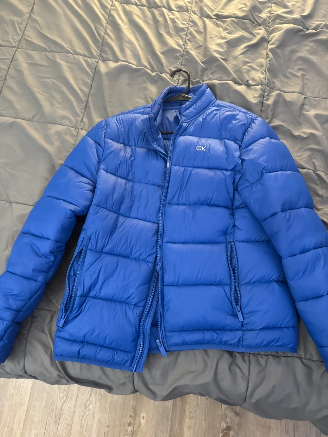 Bright blue Calvin Klein puffer jacket. It's a stylish and warm outerwear piece. It features a full zip closure and zippered pockets. A great jacket for cooler weather!