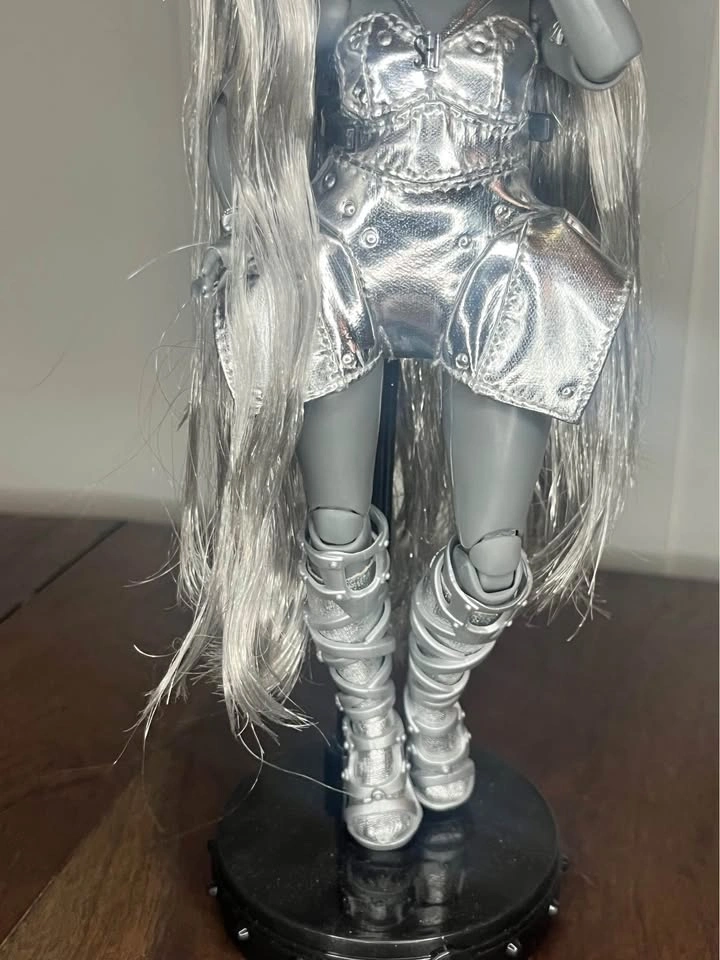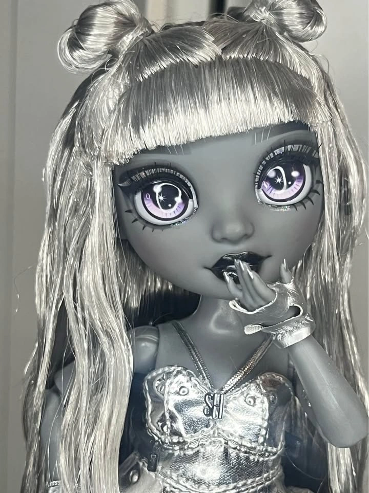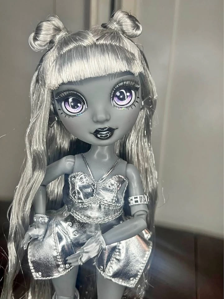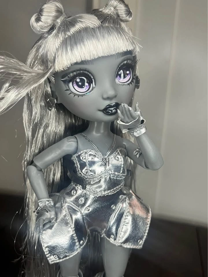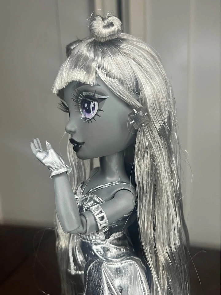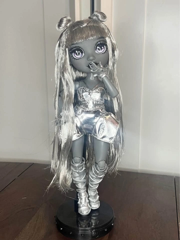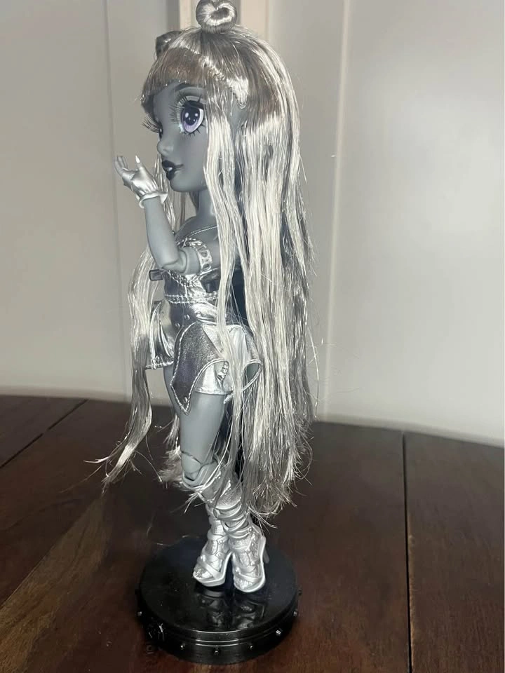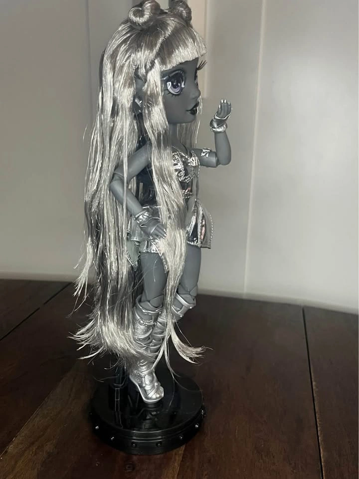 Shadow High Luna Madison ~ She is NEW out of box, complete 1st Version outfit, earrings and bracelet used as arm band. Monochrome skin tone/ metallic outfit. Her eyes are lovely lavender hue and stand out against her monochrome skin tone! Luna comes with her stand, earrings, original hair style. Pick up Etobicoke: Martingrove/Silverstone